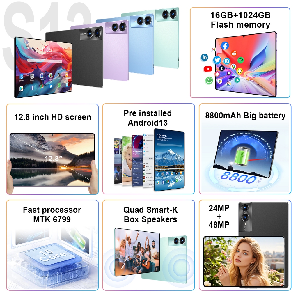 KLOURUS Tablet S13 (16GB + 1024GB) | IPS 12.8" | Tablet Murah untuk Belajar,Gaming, Kerja & Hiburan | 5G Dual SIM, WiFi Tablet Anak Android, Kamera 48MP | Kapasitas baterai besar 8800 mAh [KLOURUS Official Store]