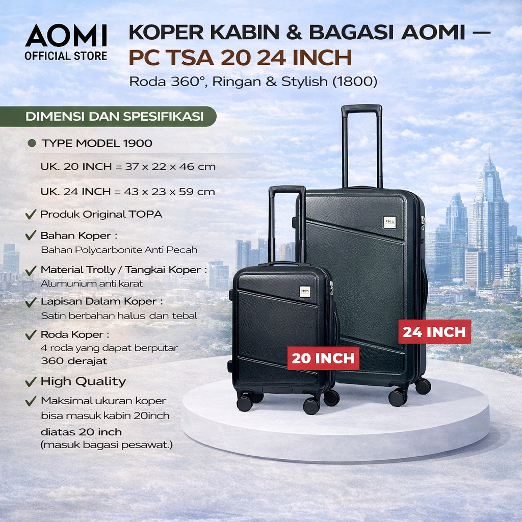 Koper Kabin & Bagasi AOMI – PC TSA 20 24 Inch, Roda 360°, Ringan & Stylish (1800)