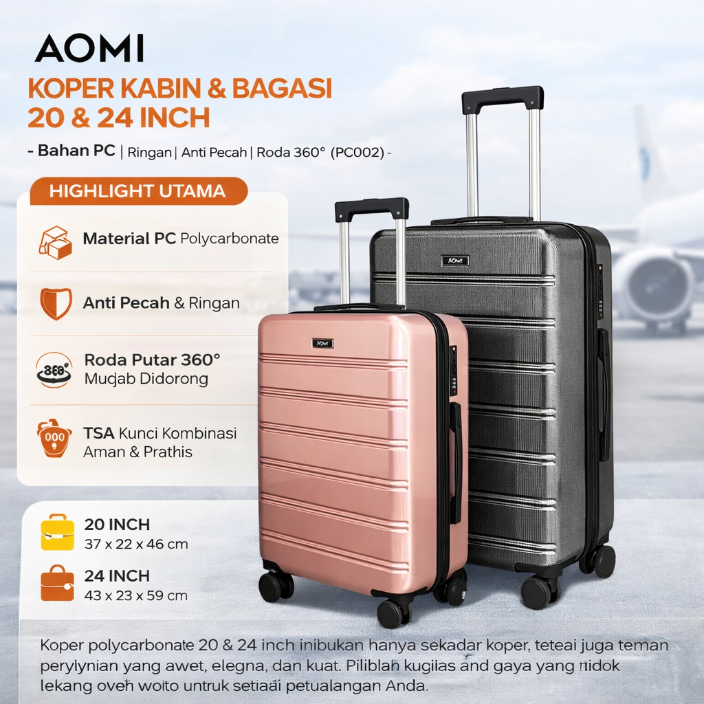 Koper Kabin & Bagasi 20 & 24 Inch – Bahan PC, Ringan, Anti Pecah, Roda 360° (PC002)