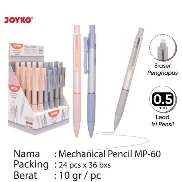 ( 1 pcs ) MP60 Joyko Mechanical Pencil with Eraser / Pencil Mekanik MP-60 ketebalan 0.5mm dengan penghapus warna Pastel