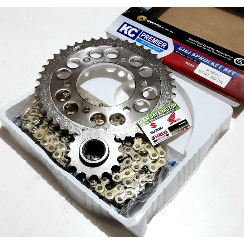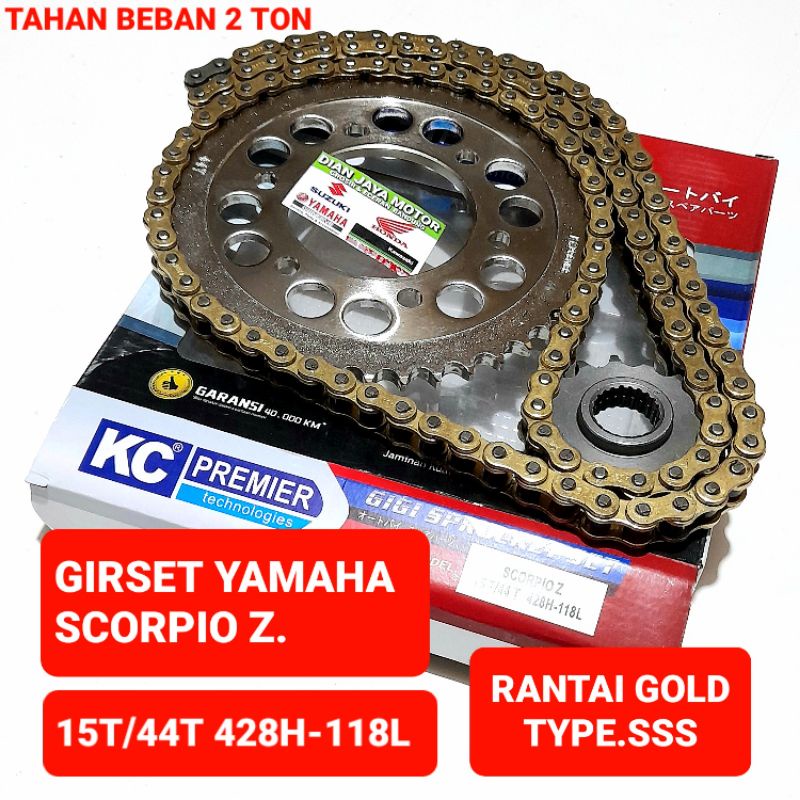 ( KC Premier ) Girset Yamaha SCORPIO Z 15T/44T 428H-118 Kc premier Type SSS warna Gold Chain tebal Baja asli