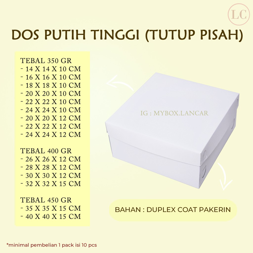 (10 LEMBAR) BOX TART PUTIH IVORY 24 X 24 X 12 CM, DUS TART PUTIH TUTUP PUTIH, KEMASAN TAR KUE SNACK CAKE