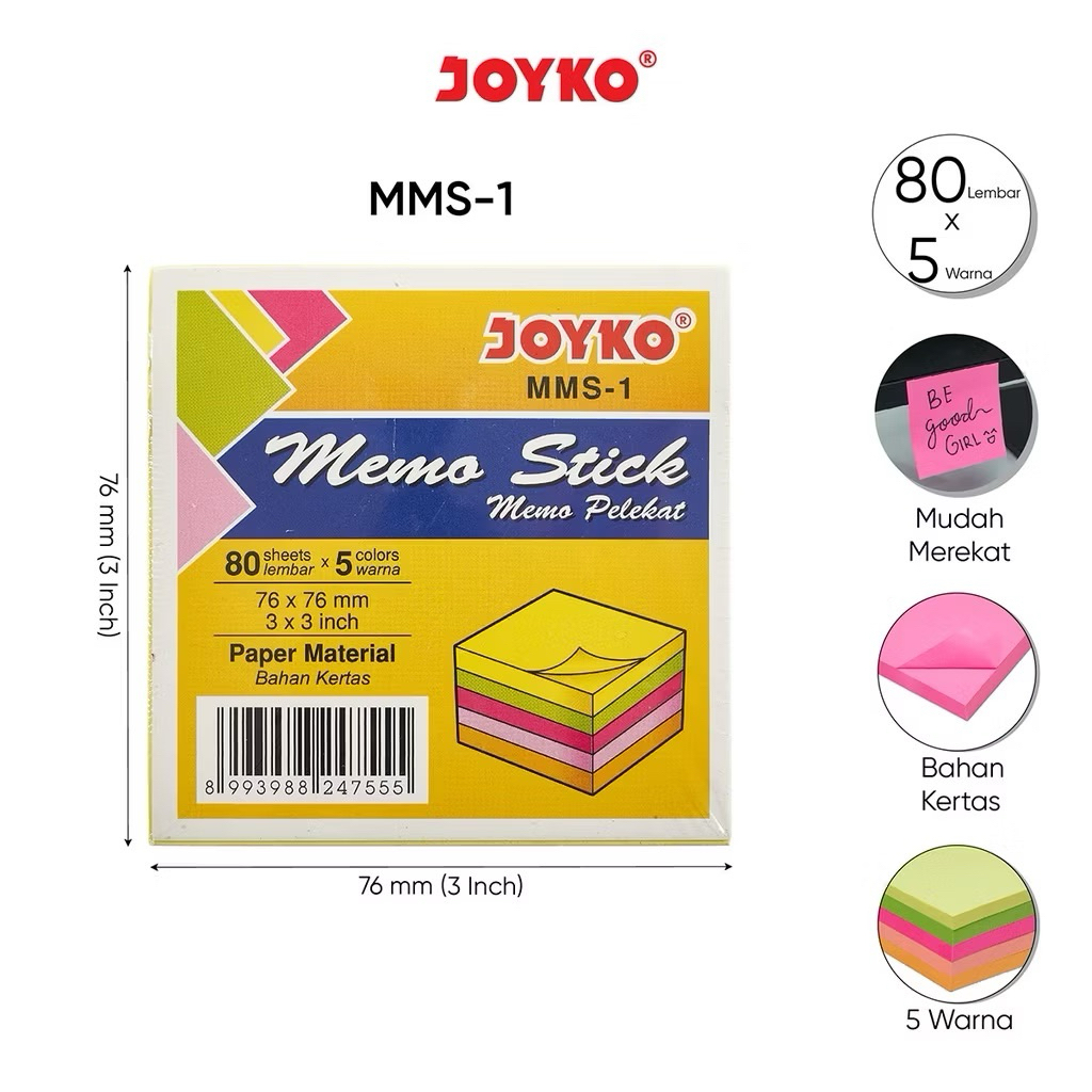 (400 LEMBAR) Kertas Memo Stick Tempel 5 Warna JOYKO MMS-1 Mix Color Sticky Note (7.6x7.6 Cm)