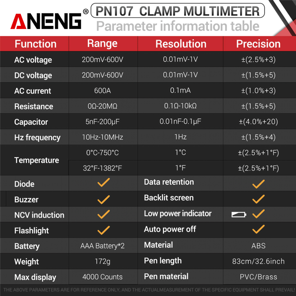 (Paket A) Aneng PN107 Pro Digital Clamp Meter 600V AC Volt Multitester NCV Bazer
