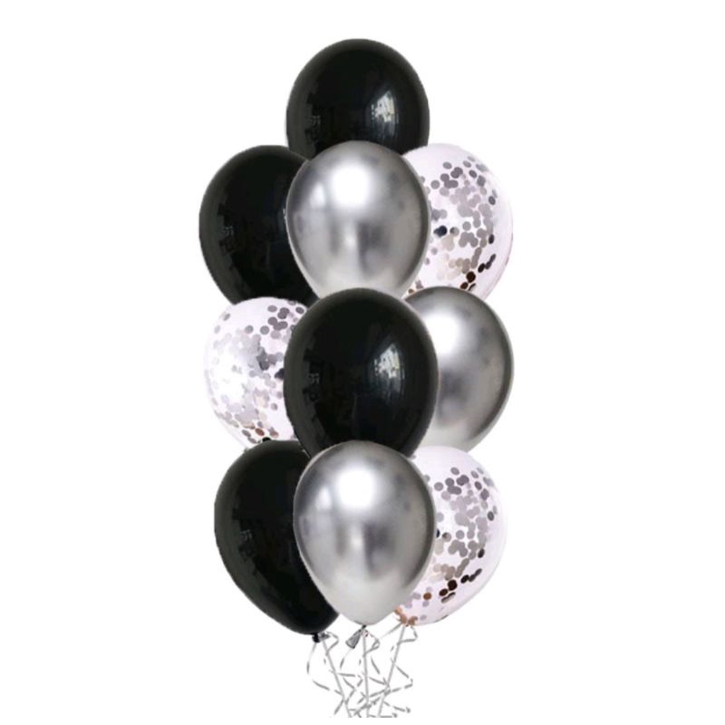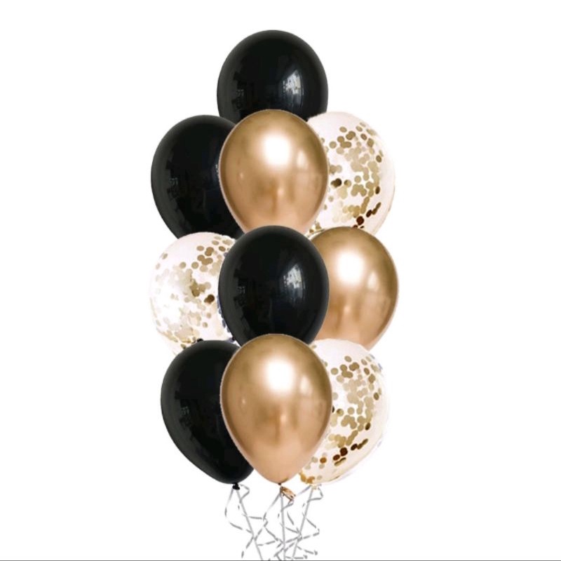 [1 SET] MIX BALON METALIK + BALON KONFETI Balon Hitam Emas & Perak