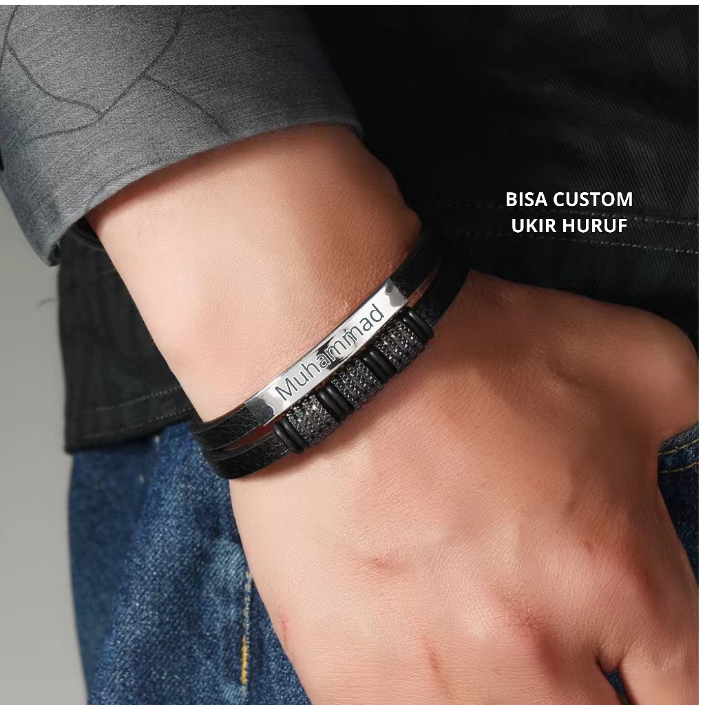 [Custom Nama] Gelang pria titanium kulit anti karat/ birthday gift Gelang cowok keren original 100%