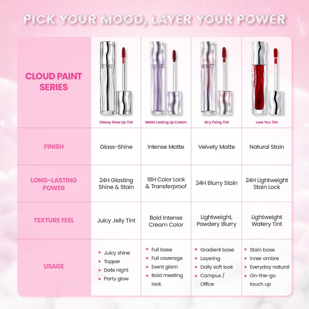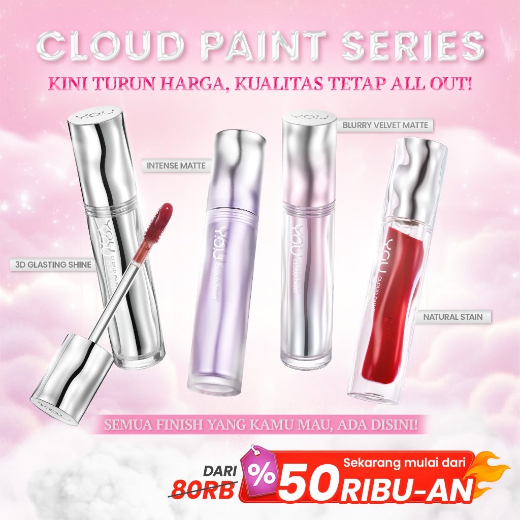 [HARGA TERMURAH RAMADAN] YOU Cloud Paint Lip Collection 4 Finish: Matte Lip Cream, Glassy Glow Lip Tint, Watery Love You Tint & Airy Velvet Tint | 4in1 Lip Product Tahan Lama 24 H Transferproof Anti-Geser High Stain High Pigmented
