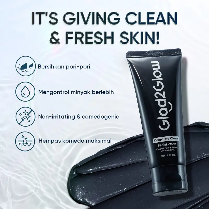 Glad2Glow Deep Pore Clean Facial Wash Pembersih Wajah Charcoa Volcanic Soil BHA Salicylic Acid Deep Cleansing Minyak Berlebih Kotoran jerawat Blackhead Exfoliate Gentle Foam Non Drying Non rritating Untuk Kuit Berminyak sabun cuci muka G2G Cleanser