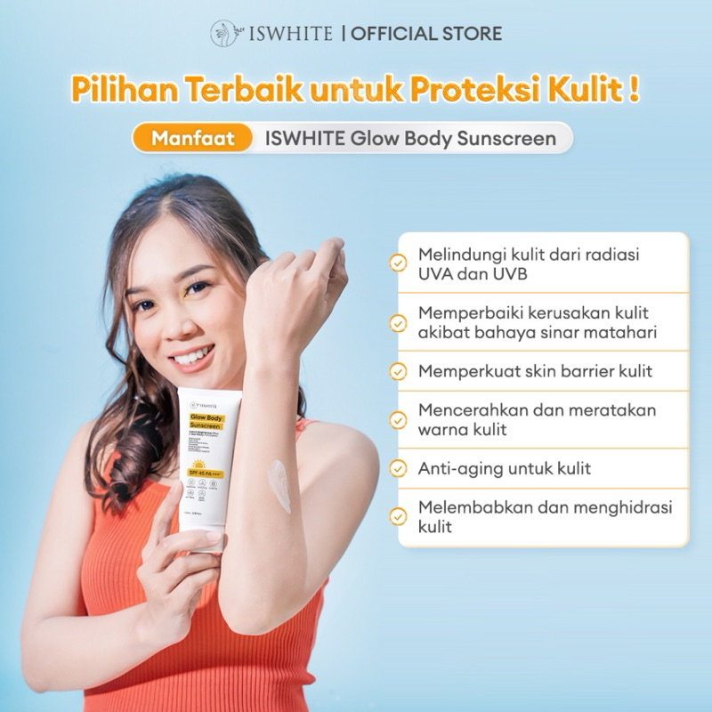 [NEW LAUNCHING] ISWHITE Glow Body Sunscreen SPF 45 PA +++ | Hybrid Sunscreen dengan kandungan Anti Aging dan Skin Barrier Prottector | Melindungi dari UVA & UVB | Aman Bumil, Busui, dan Kulit Sensitif | Halal & BPOM