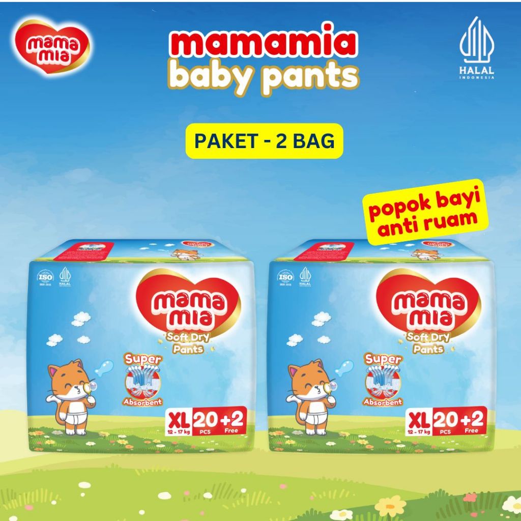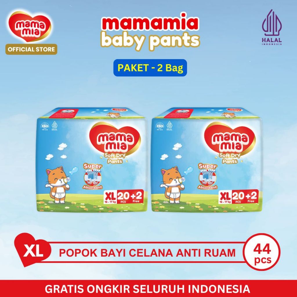 [Paket 2BAG] MAMAMIA Popok Bayi Anti Ruam HALAL XL20+2 Pcs x 2 BAG - Soft Dry Pants Xtra Lembut Xtra Kering
