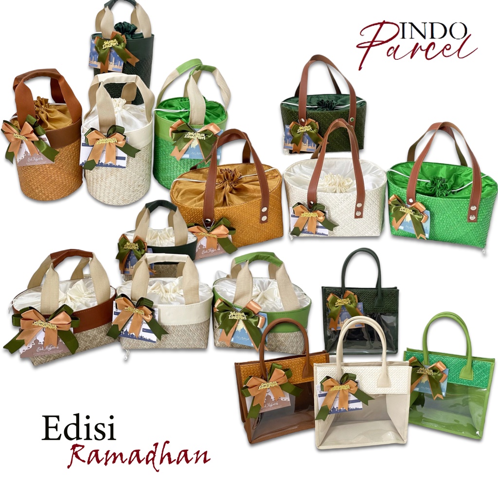 [SPECIAL RAMADHAN] INDOPARCEL - Tas Hampers Anyaman Godie Bag Kombinasi Bunga Pita dan Kartu Ucapan Idul Fitri