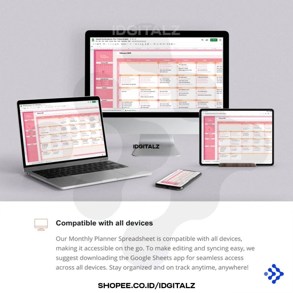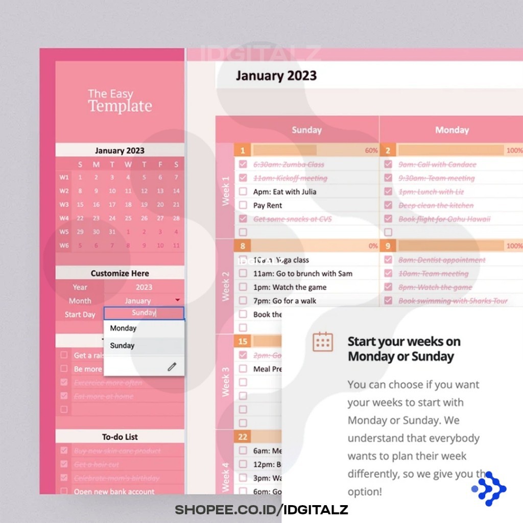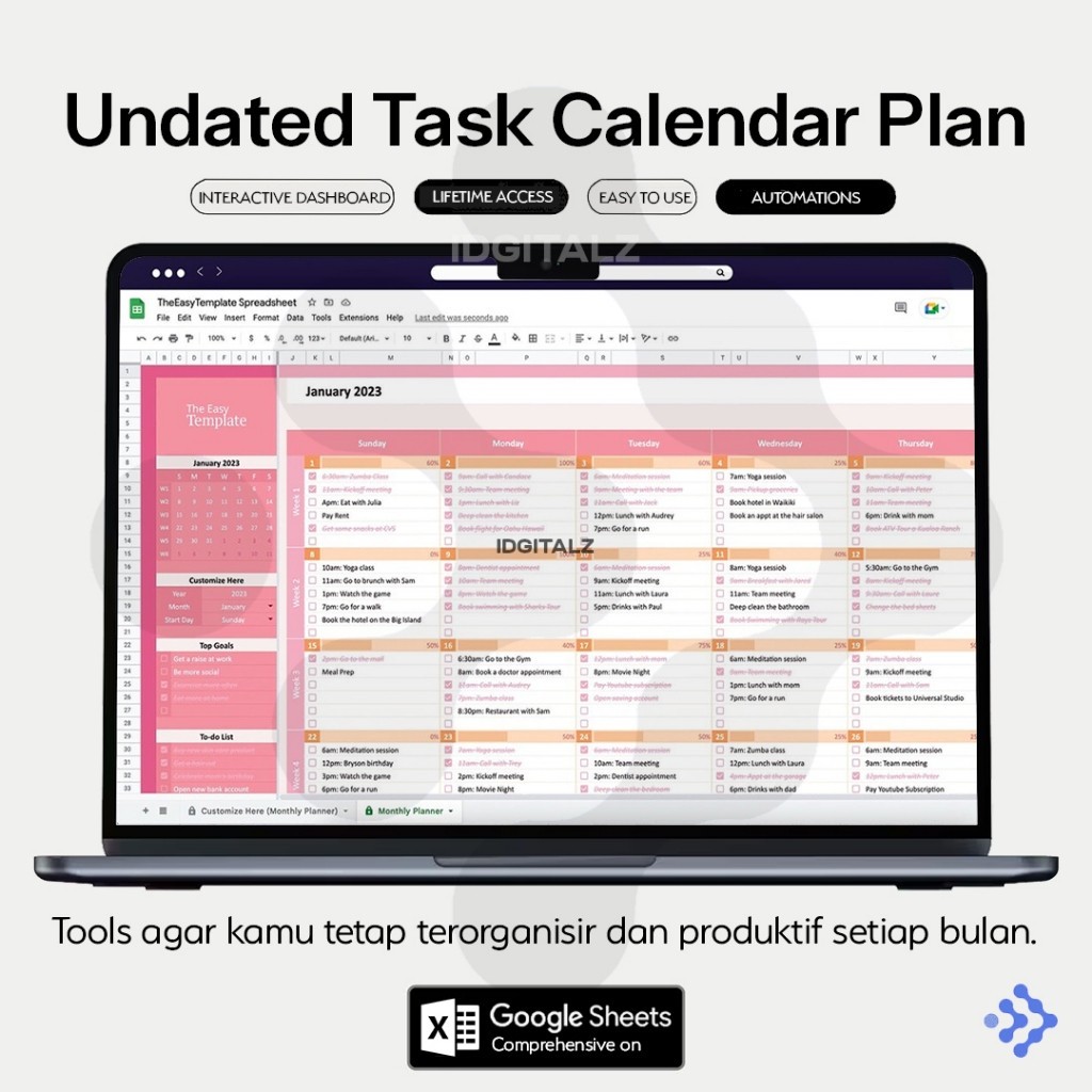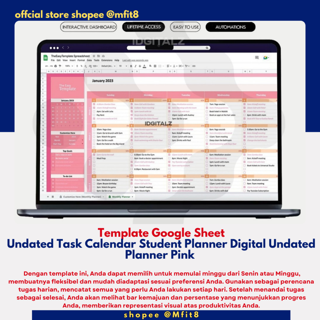 [T0132] Undated Task Calendar - Student Planner Digital Undated Planner Pink Spreadsheets That Girl Aesthetic Monthly Planner iPad Daily Planner 2023 Google Sheet Calendar | Excel & Google Sheets