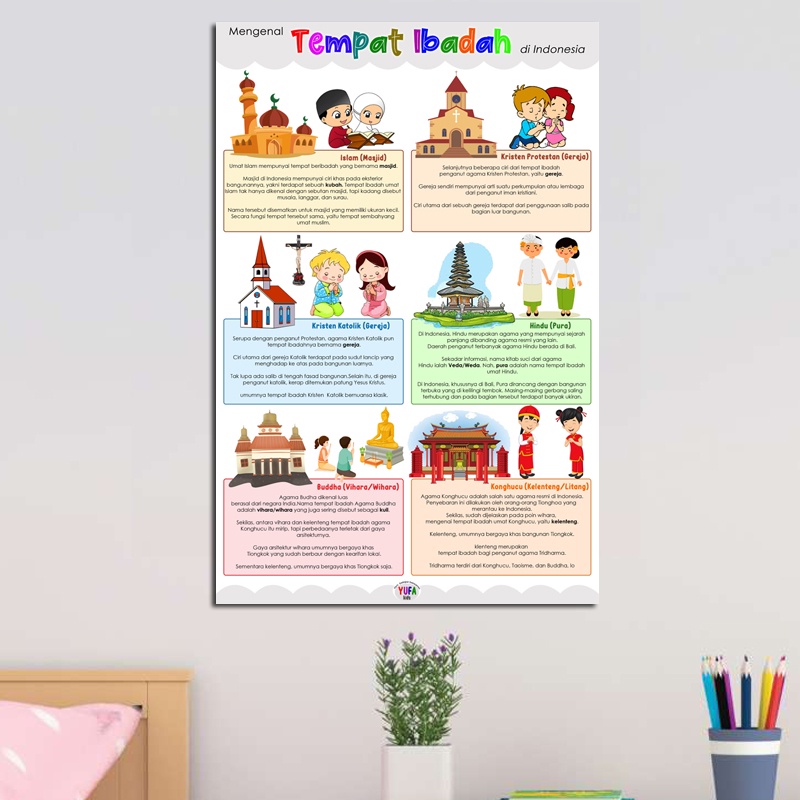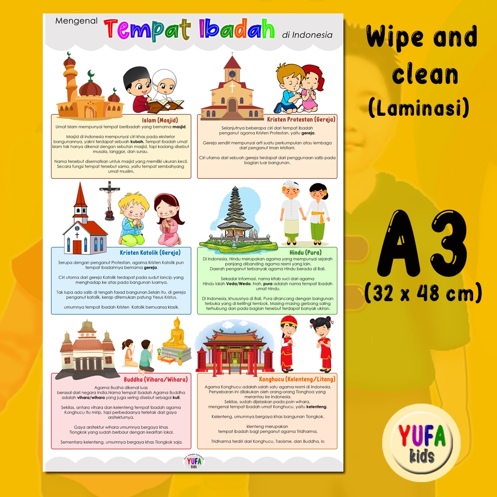 002 Poster mengenal tempat ibadah - Poster Edukasi Anak - Poster belajar anak - Poster wipe and clean - perlengkapan belajar anak - poster dinding murah - poster anak paud / TK - poster anak SD - poster anak islam