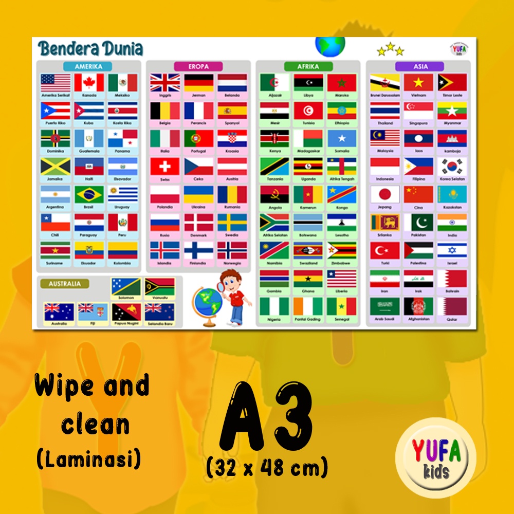 113 poster mengenal bendera dunia - Poster Edukasi Anak - Poster belajar anak - Poster wipe and clean - perlengkapan belajar anak - poster dinding murah - poster anak paud / TK - poster anak SD