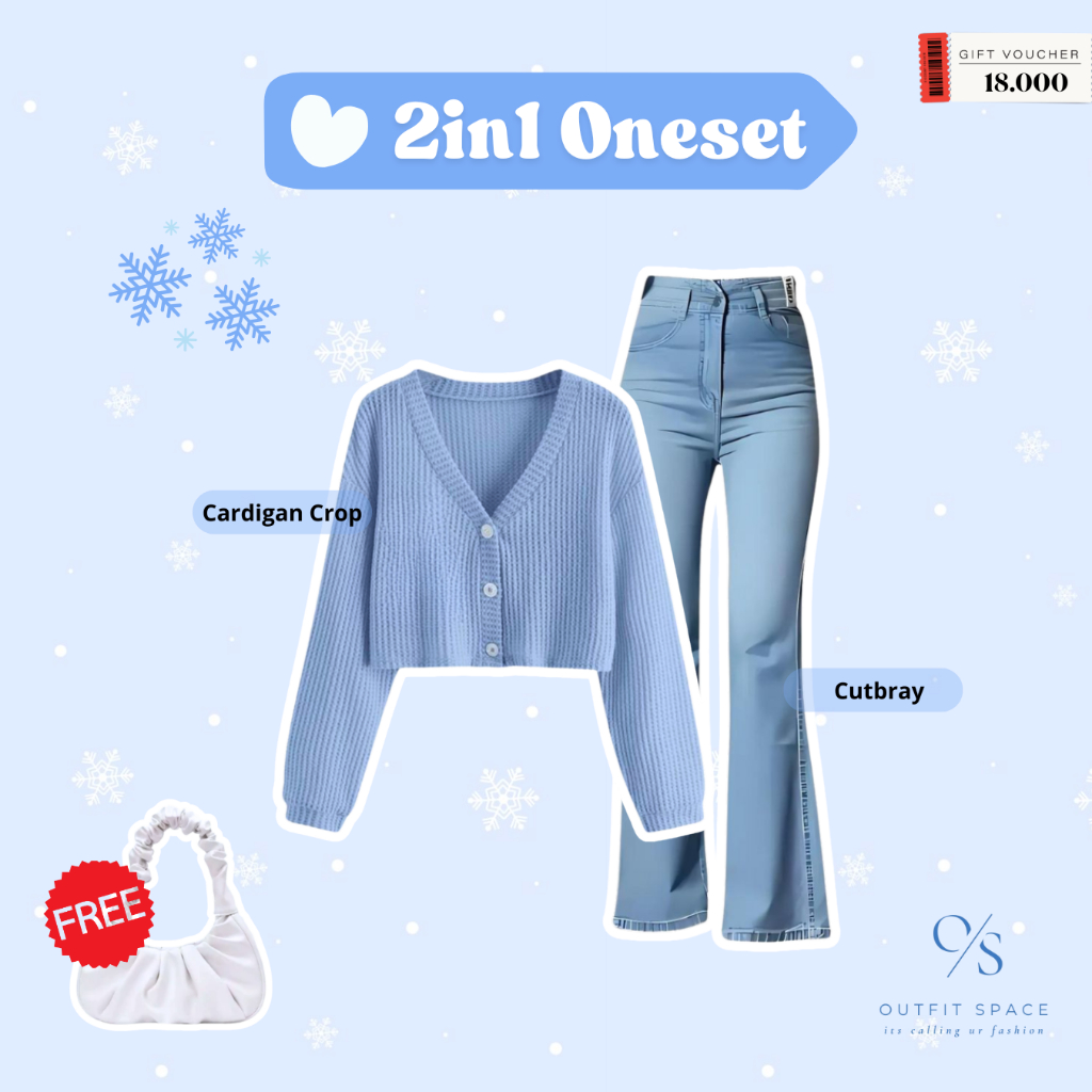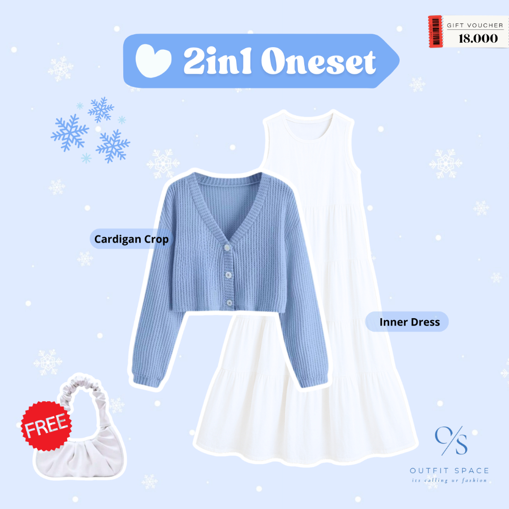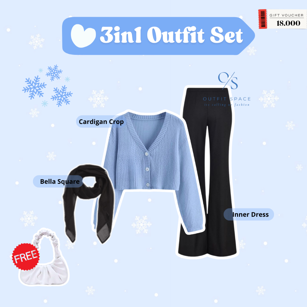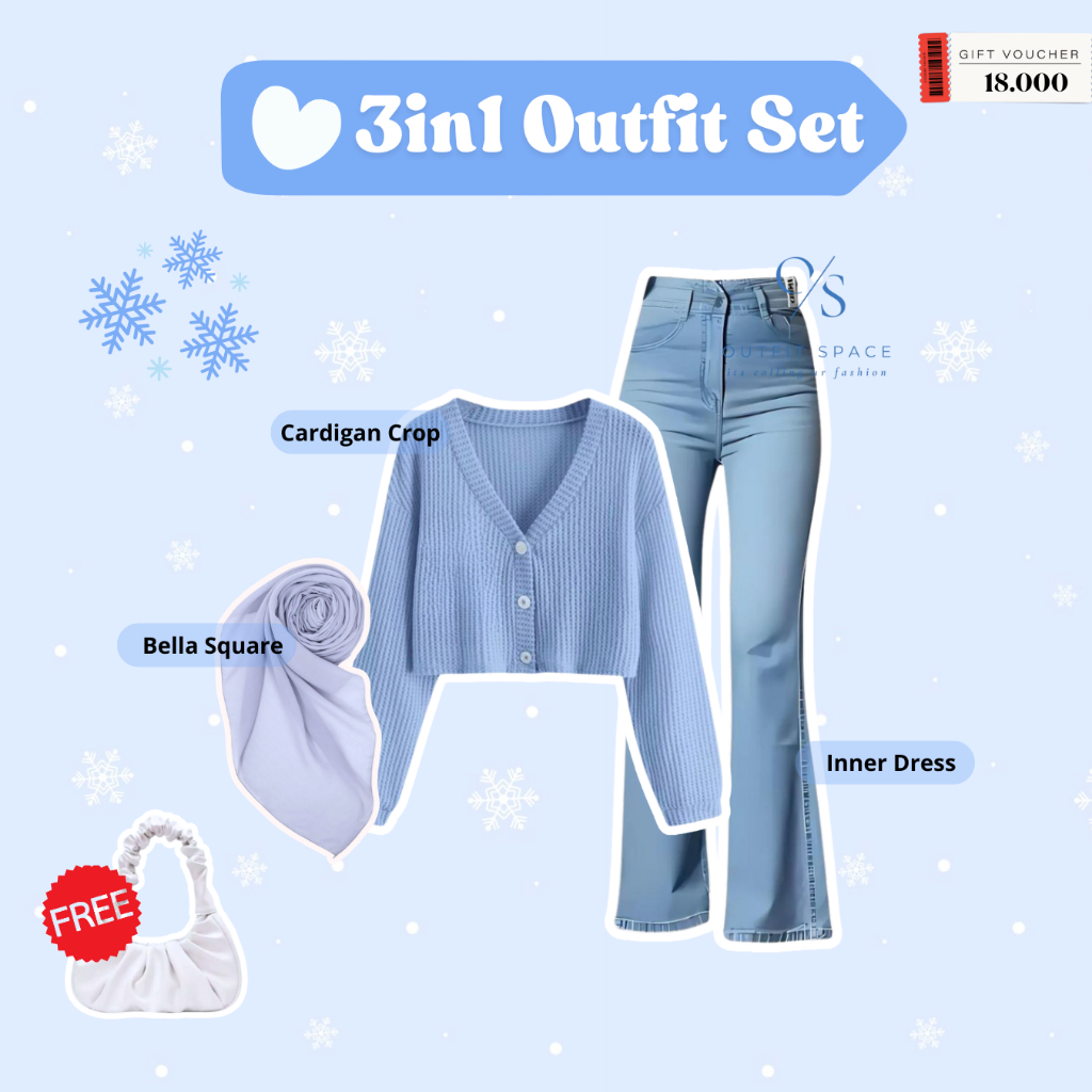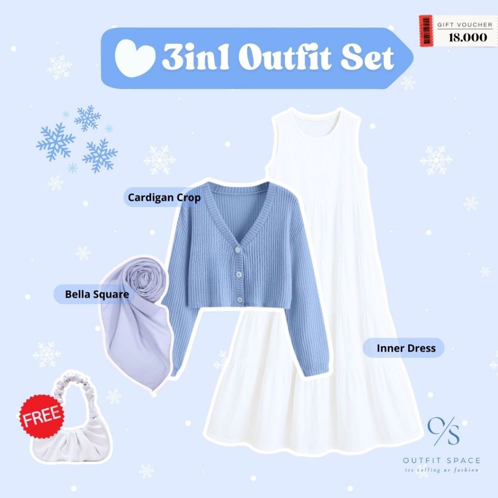 1 Set Outfit Hijab Remaja Korean | Cardigan Crop Baby Blue, Hijab Bella Square Abu, Inner Dress Putih Ruffle | Setelan Rok Wanita - OS51