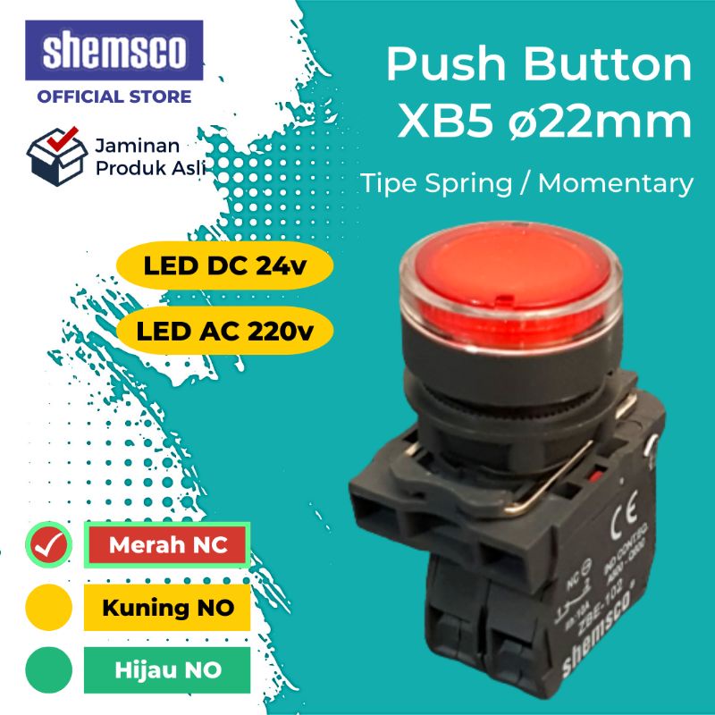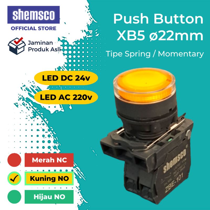 22mm LED 220v 24v Push Button Spring Tombol SC5 XB5 AW Shemsco KW Schneider Hijau Merah Kuning