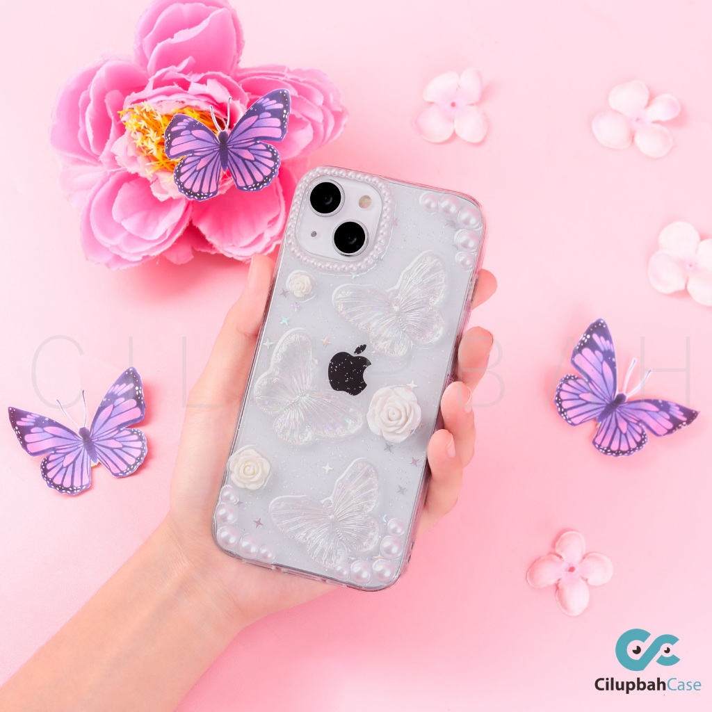 3D Pearl Flower Butterfly Girly Glitter Clear Case For iPhone XR XS MAX 11 12 13 14 15 Plus Pro Max