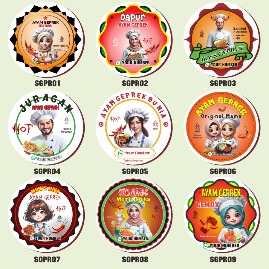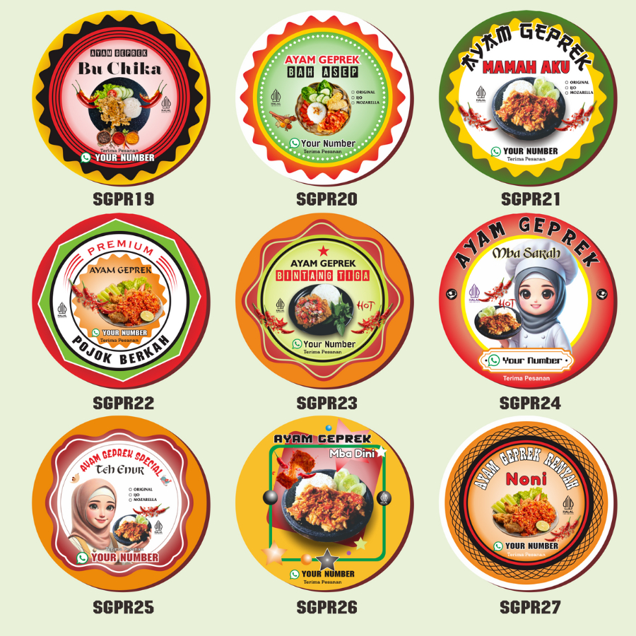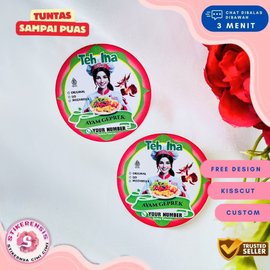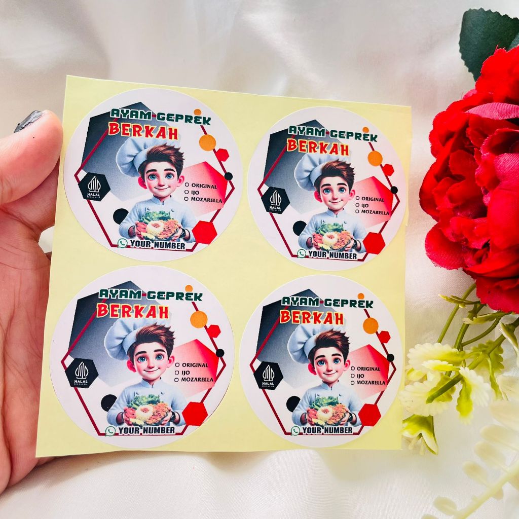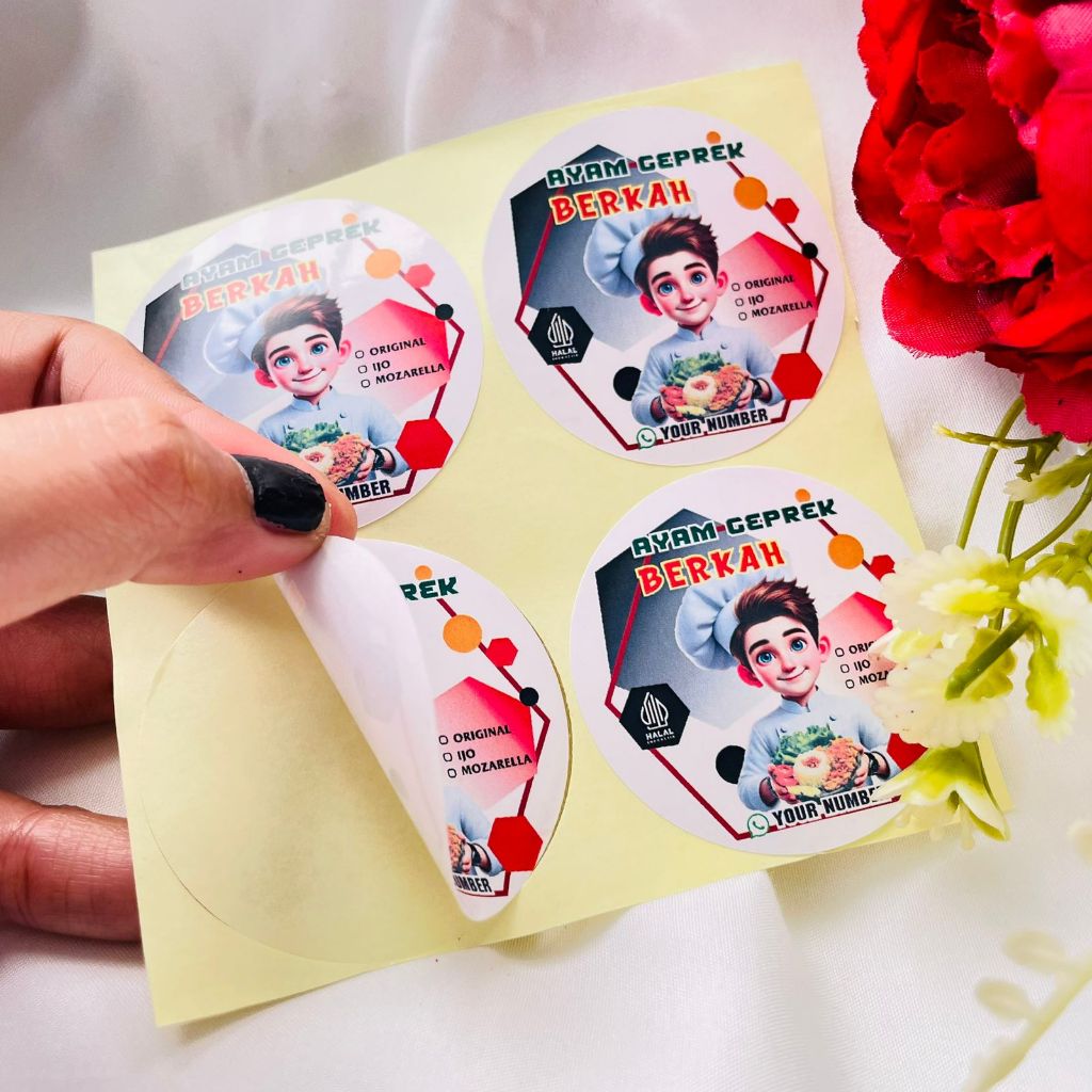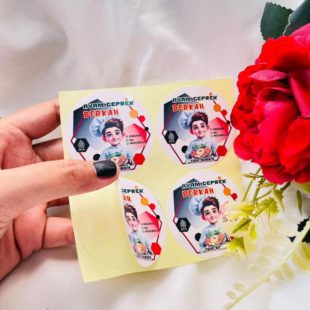 5-8 Stikerensis Cetak Label Makanan Ayam Geprek Free Desain Sticker Custom Nama Stiker Bulat Sedang