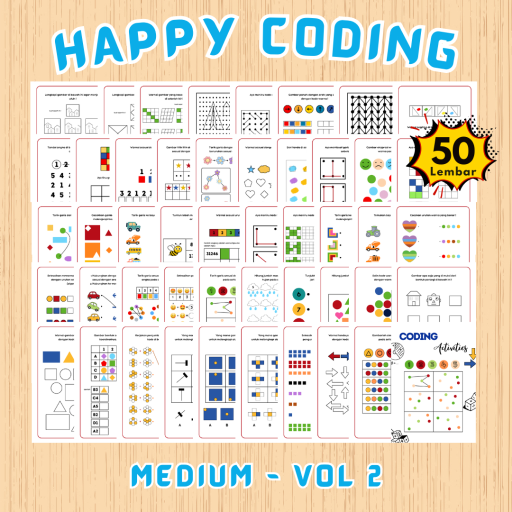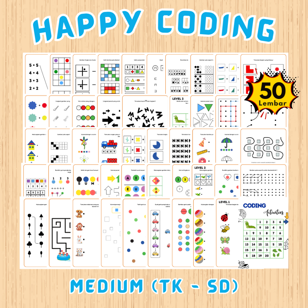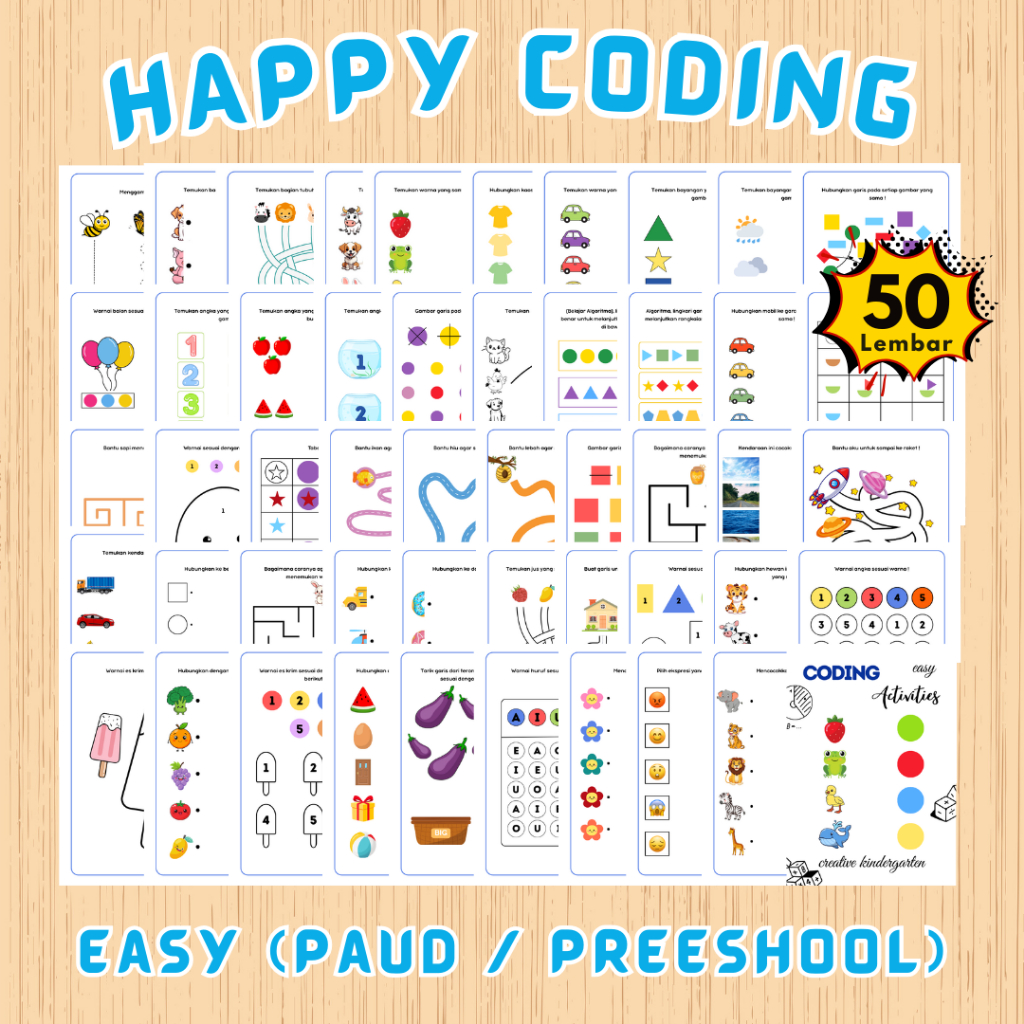 50 lembar Worksheet Coding Anak kertas aktivitas untuk PAUD TK SD HVS A5