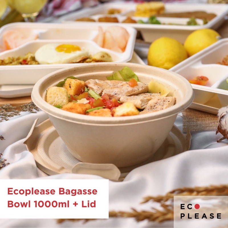 50pcs Ecoplease 1000ml Bagasse Food Bowl + Lid Mangkuk Sekali Pakai Home Compostable Ecofriendly Ramah Lingkungan Biodegradable Ampas Tebu
