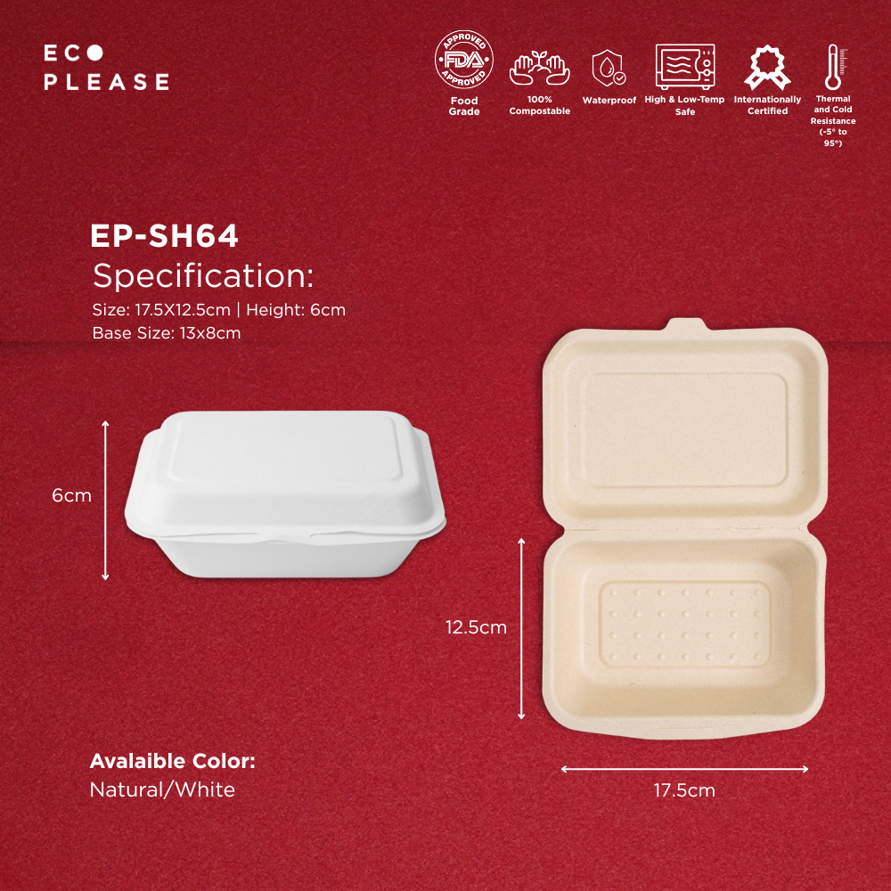 50pcs Ecoplease 6x4" Bagasse Clamshell Lunch Box Home Compostable Ecofriendly Ramah Lingkungan Biodegradable Ampas Tebu