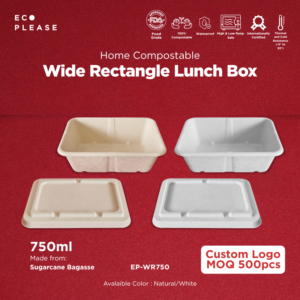 50pcs Ecoplease 750ml Bagasse Wide Square Lunch Box + Lid Home Compostable Ecofriendly Ramah Lingkungan Biodegradable Loyang Oven Safe & Food Grade