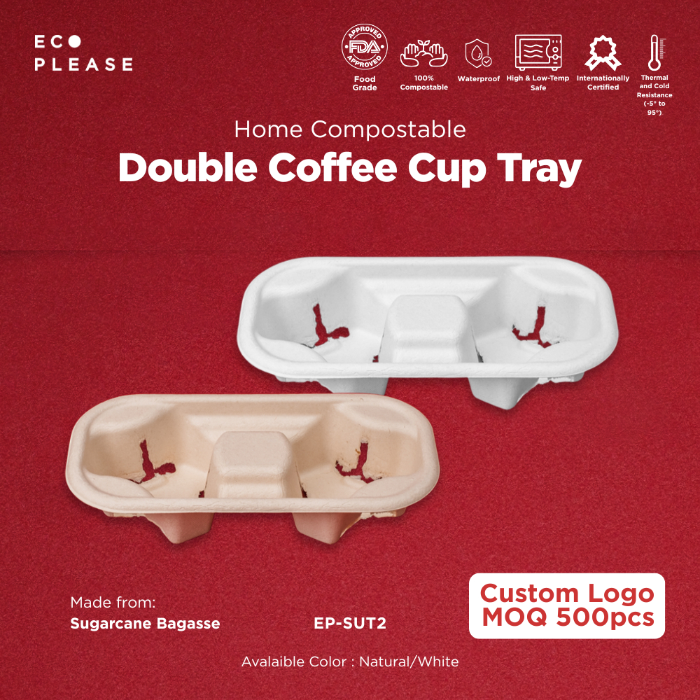 50pcs Ecoplease 21.5x11" Bagasse Double Cup Tray Nampan Tempat 2 Kopi Home Compostable Ecofriendly Ramah Lingkungan Biodegradable Ampas Tebu