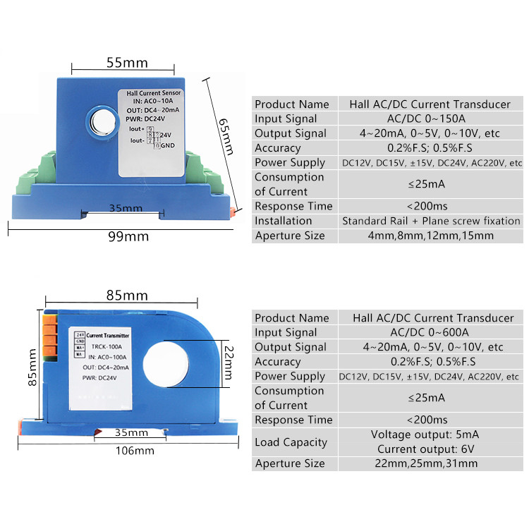 AC DC Electric Current Sensor 0-1000A Input Transducer Converter Transmitter 4-20mA 0-10V Output 24v Power Supply 22mm 31mm Hole HCT3B