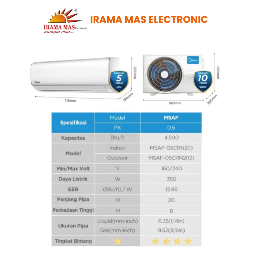AC Midea MSAF 05CRN2 | 1/2 PK + LENGKAP PASANG