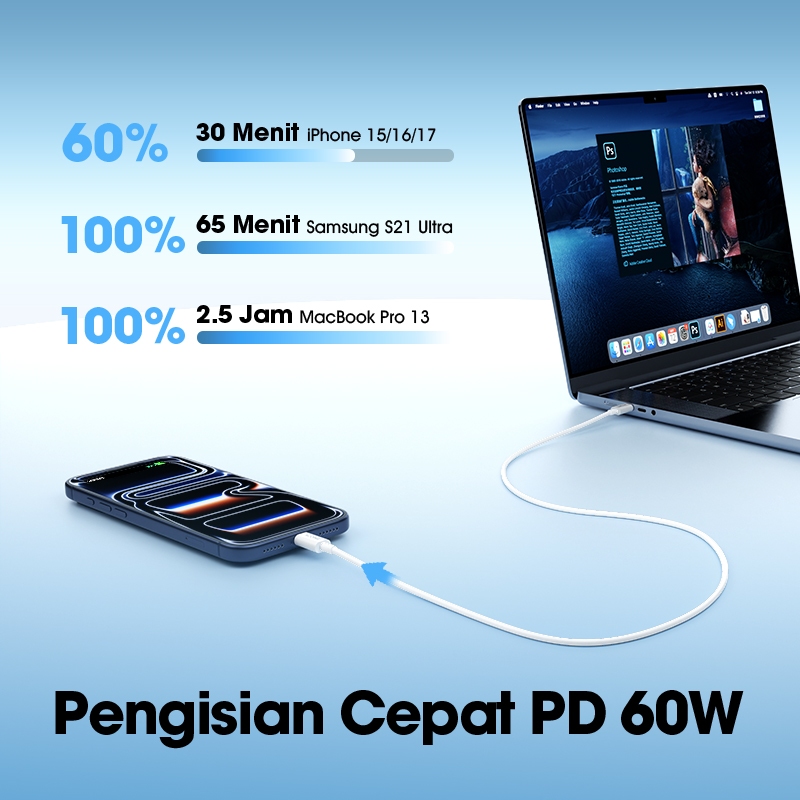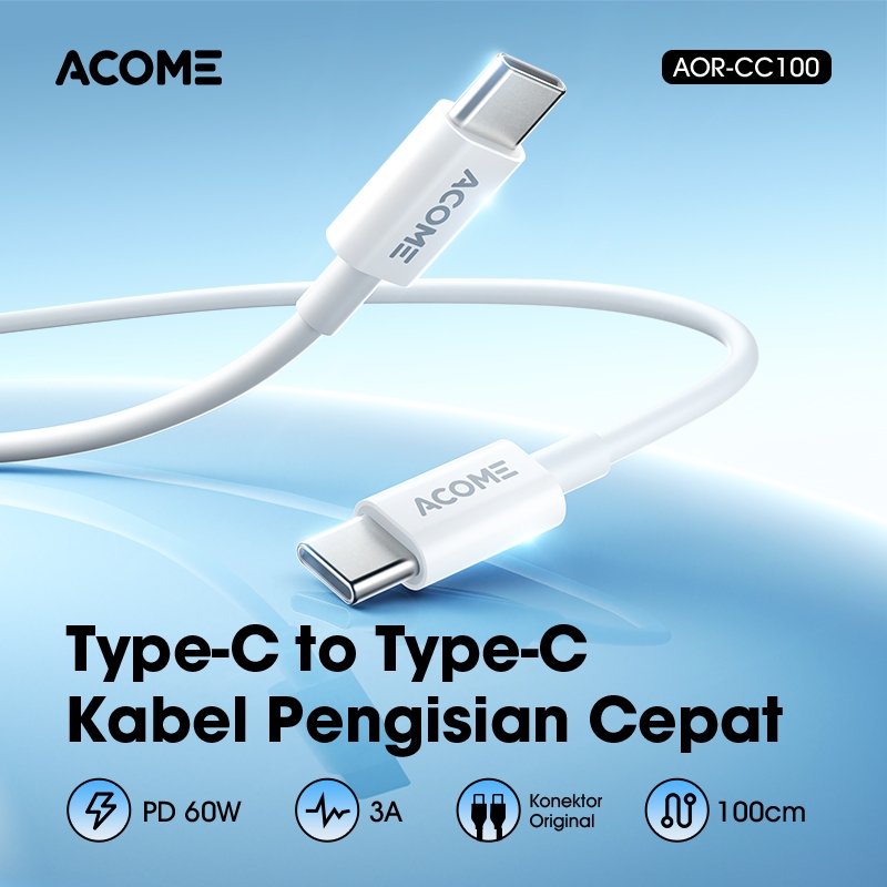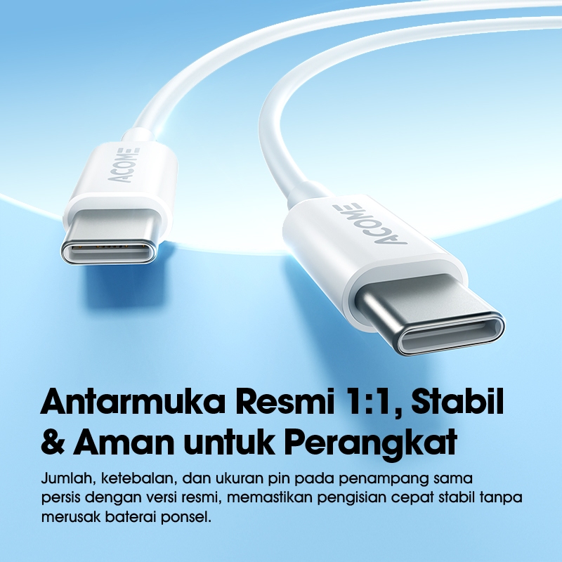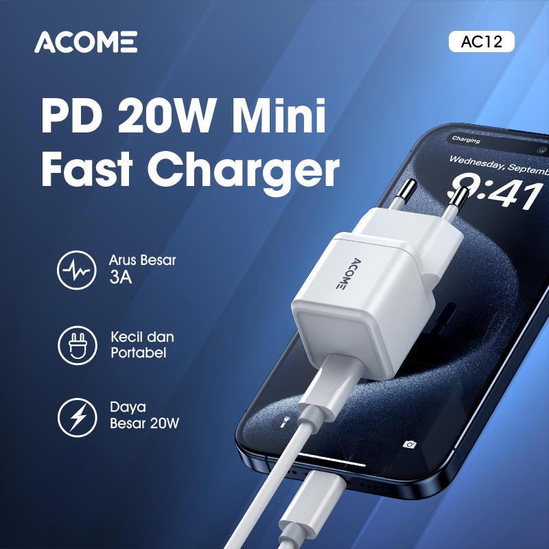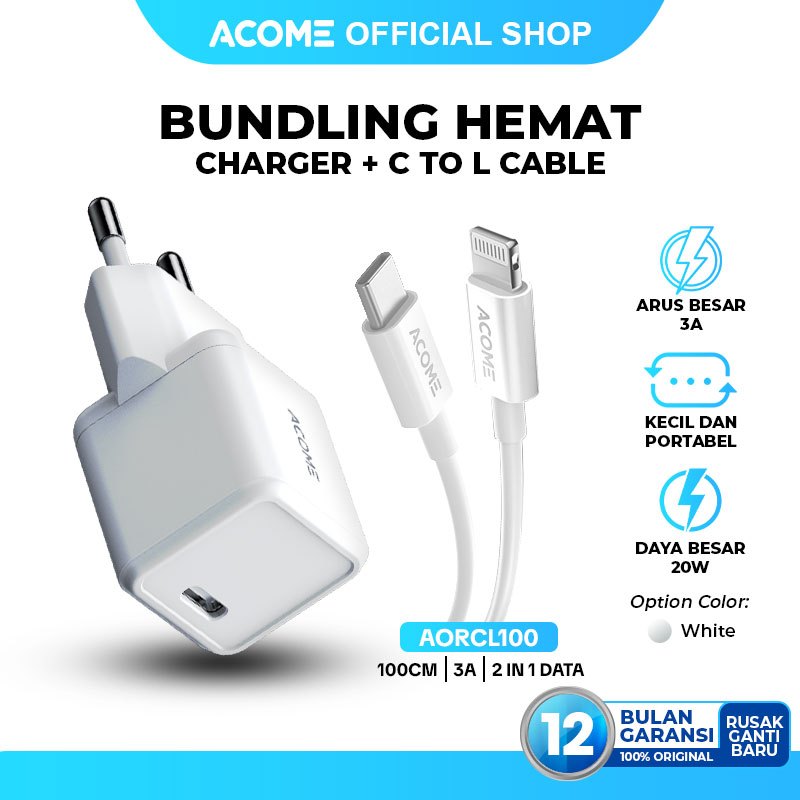 ACOME Bundling Hemat Kepala Charger AC12 Adaptor Single Port Type-C PD 20W Fast Charging White + Kabel Data Type-C / Lightning Fast Charging - Garansi 1 tahun