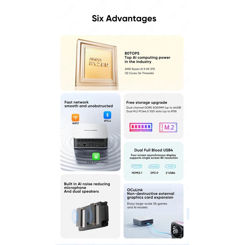 AI X1 370255 Mini PC AMD Ryzen AI 9 HX 370R7 255 OCuLink 2*USB4 WiFi7 Builtin Dual Speaker Desktop Gaming Computer