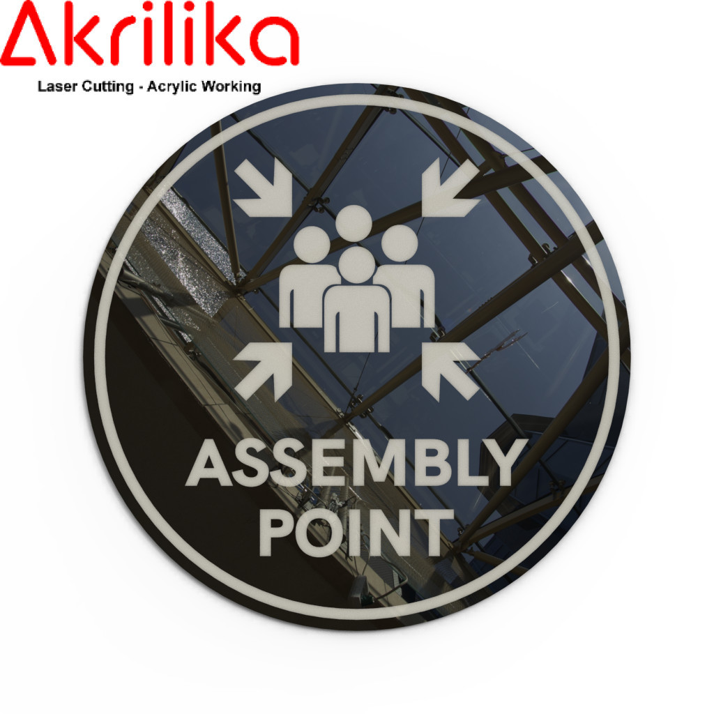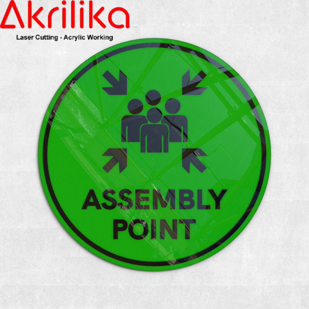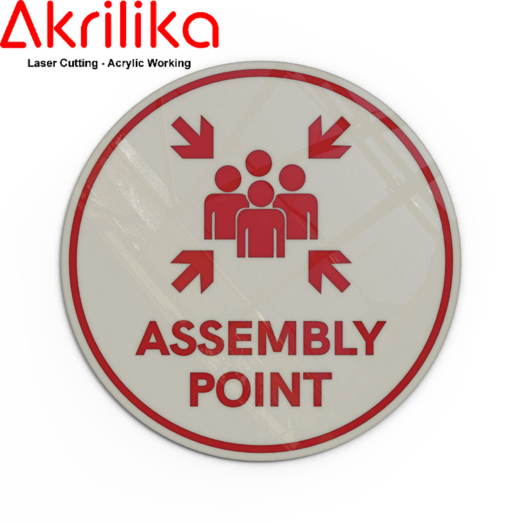 AKRILIK SIGNAG/SIGN "ASSEMBLY POINT/TITIK KUMPUL" BENTUK BULAT 20X20 CUSTOM WARNA LASER CUT AKRILIKA