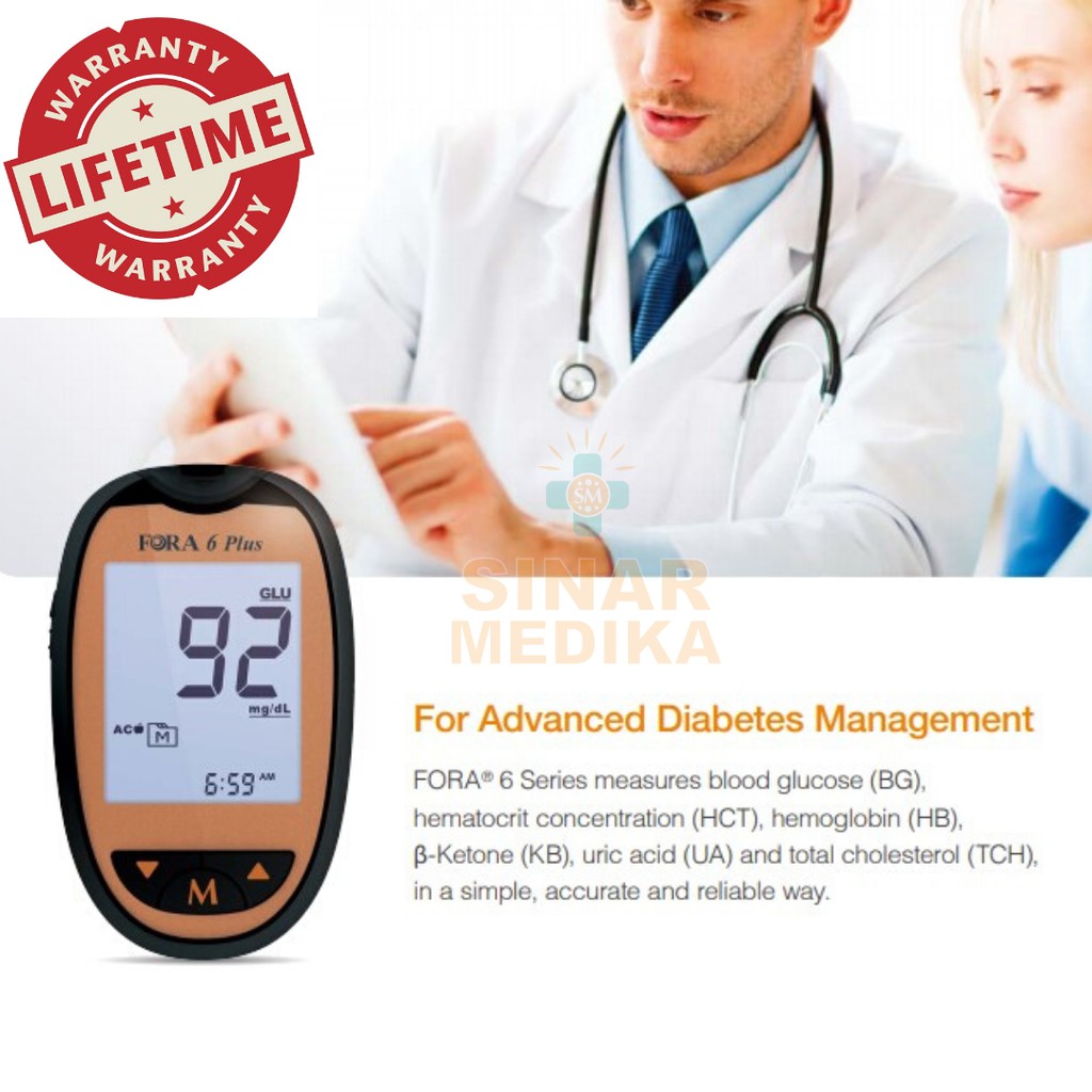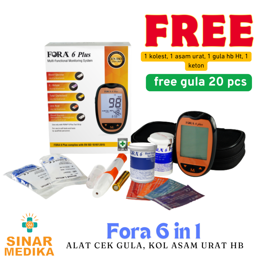 ALAT CEK GULA KOLESTROL ASAM URAT HEMOGLOBIN HEMATOKRIT KETONE 6 IN 1 FORA 6 PLUS FREE 20 pcs gula