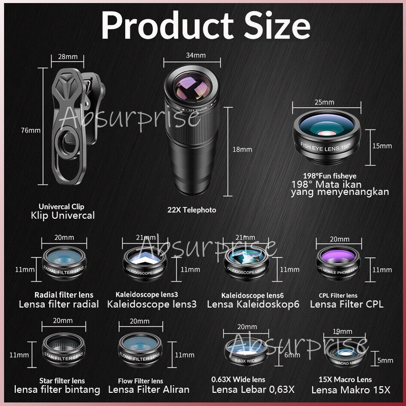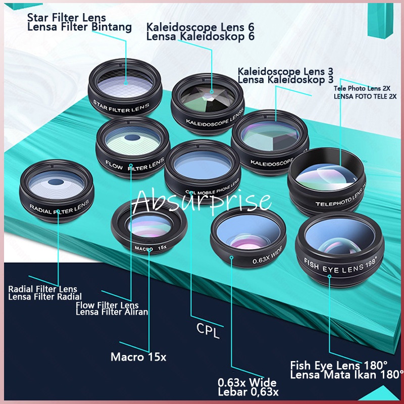 APEXEL 10 in 1 Kit Lensa Kamera Ponsel Sudut Lebar Makro Untuk Smartphone Fisheye Macro Star Wide Angle Lens - DG10 - Optonal F001 Bracket - Lensa Smartphone Wide Macro Star CPL Fisheye Komplit 10in1