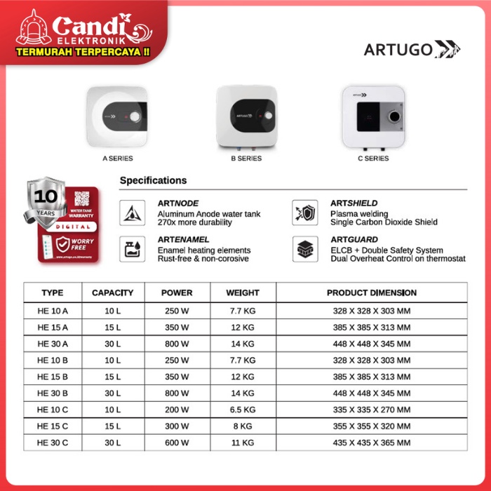 ARTUGO Pemanas Air Listrik 350 watt HE-15A Water Heater Electric