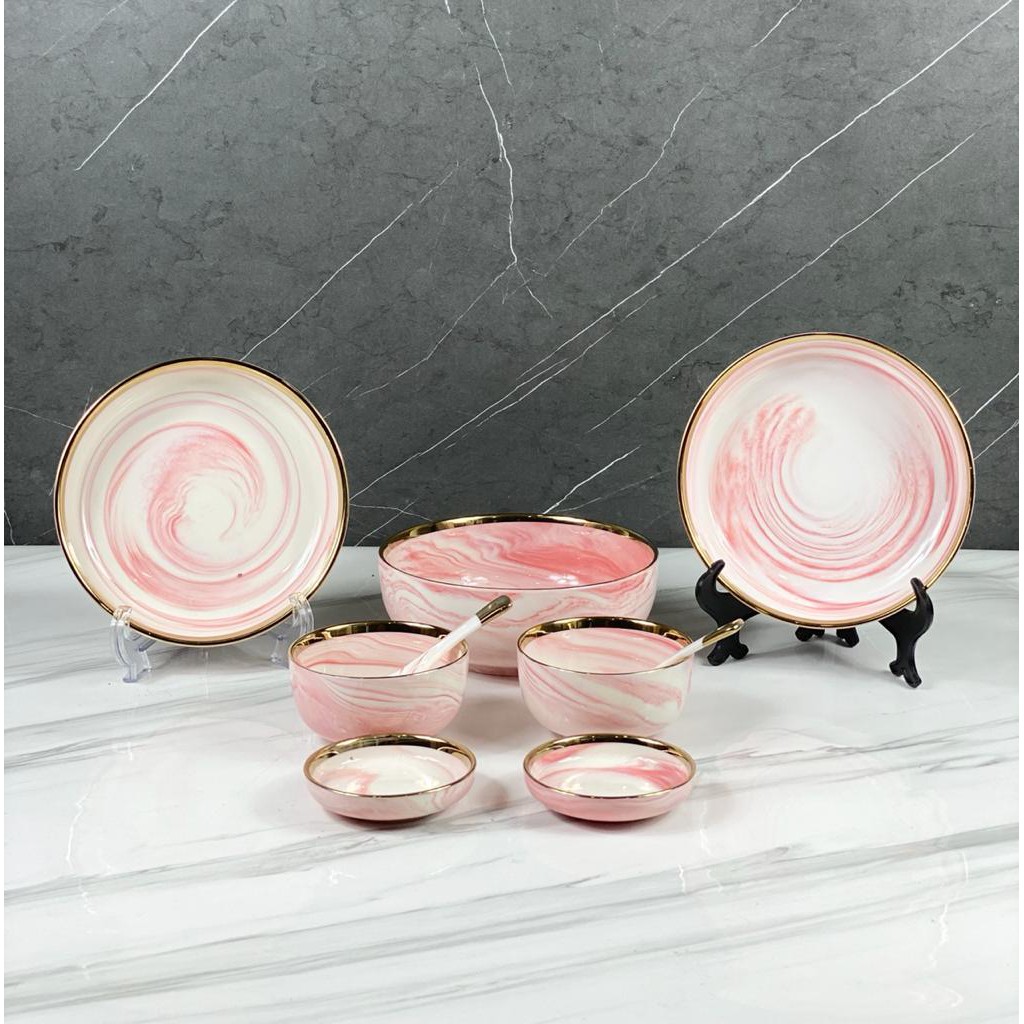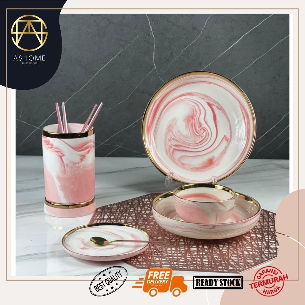 ASHOME Piring Set 4 Orang Piring Makan Set Keramik Pink Marble Isi 18 Pcs / Piring Set Keramik List Emas / Piring Set Mewah / Piring Sultan / Piring Pink Marble / Piring Aestetik