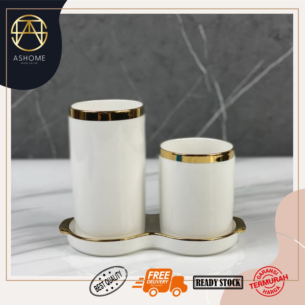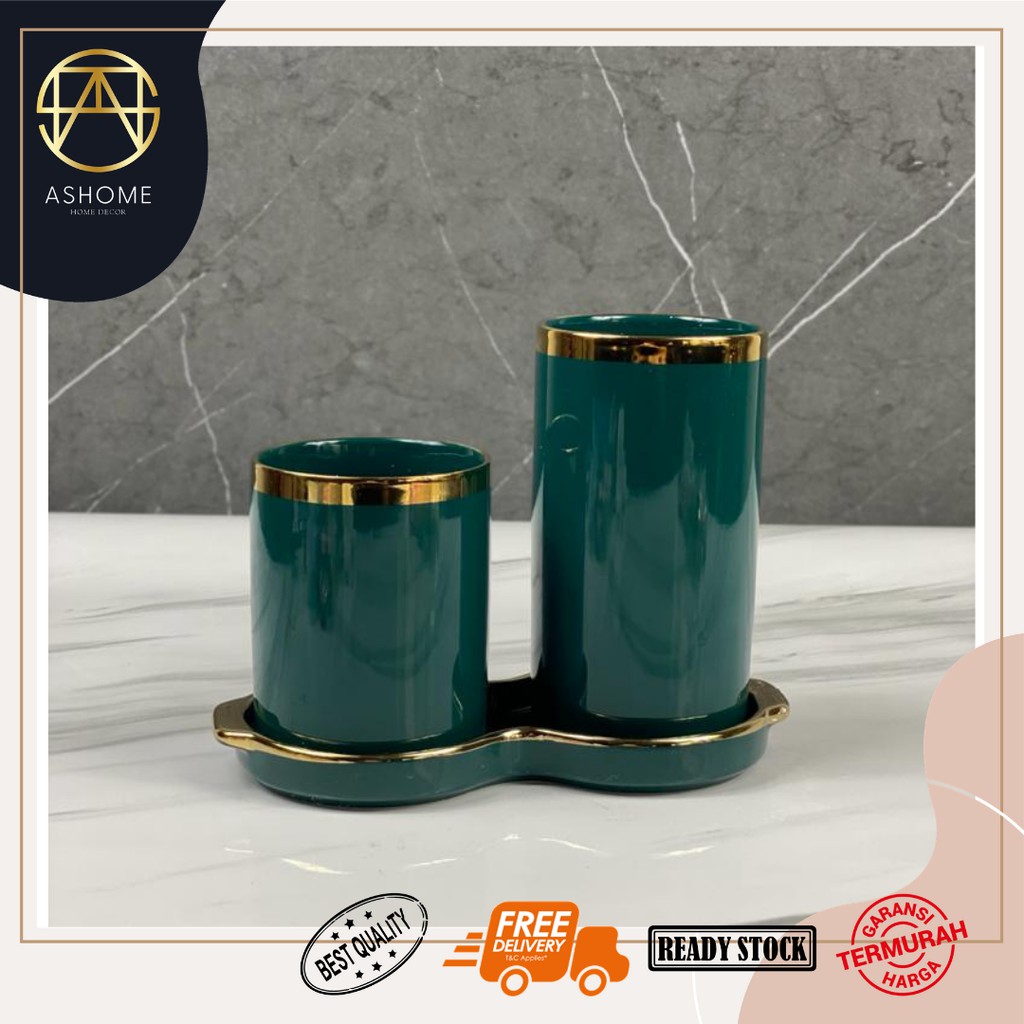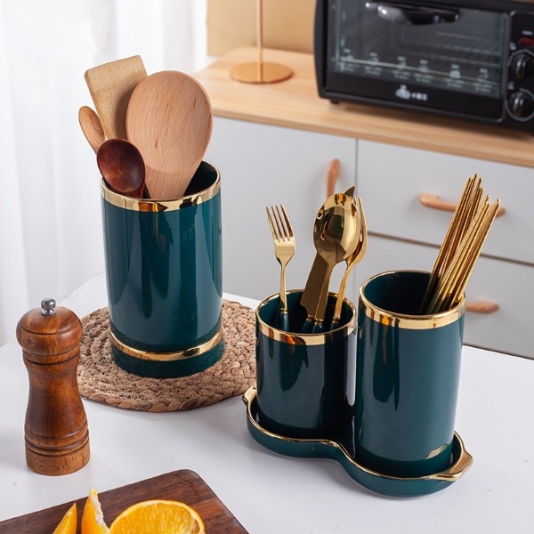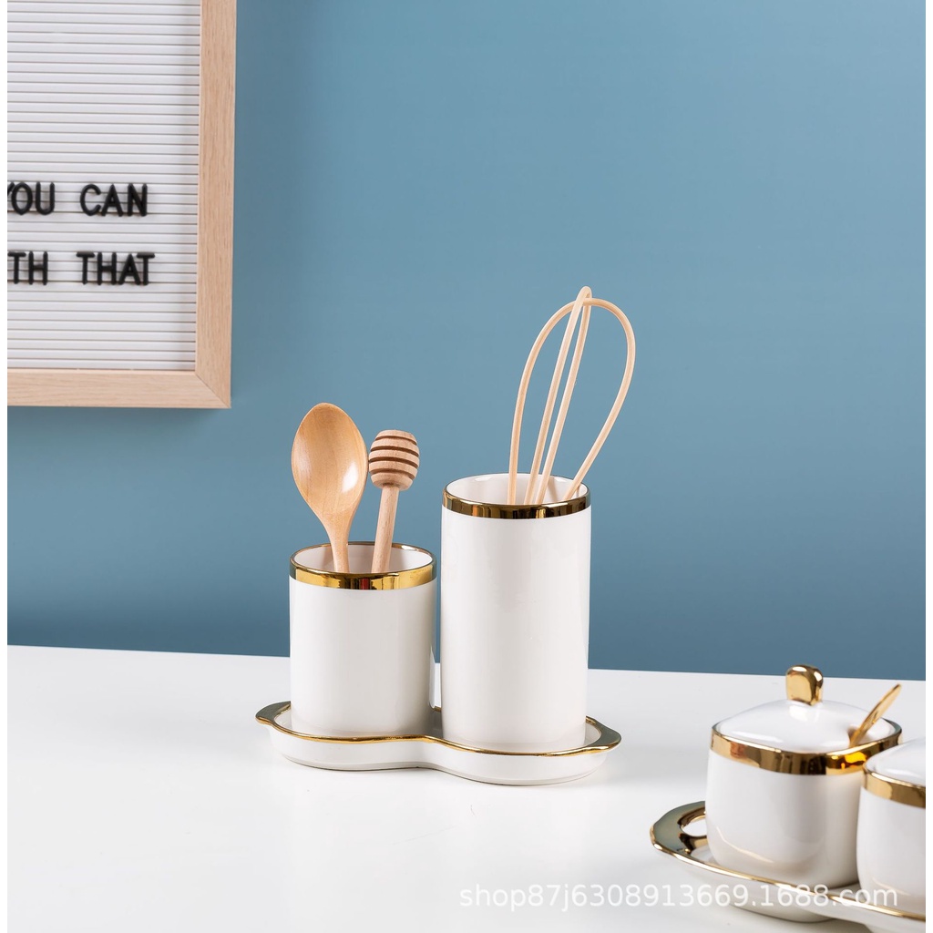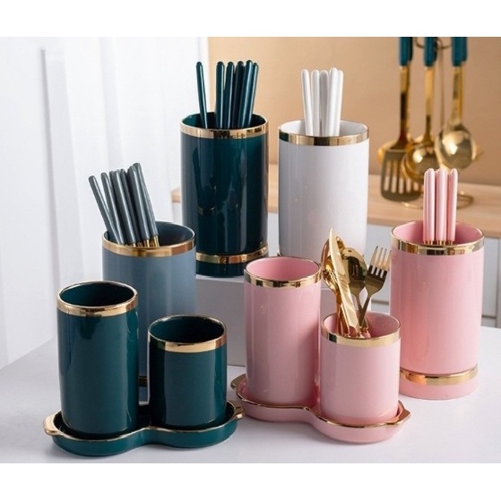 ASHOME Set Tempat Sendok Keramik dengan 2 Tabung List Gold Berbagai Warna / Tempat Sendok Aestetik / Tempat Sendok List Gold / Tempat Sendok Mewah / Tempat Sendok Aestetik / Tempat Sendok Keramik