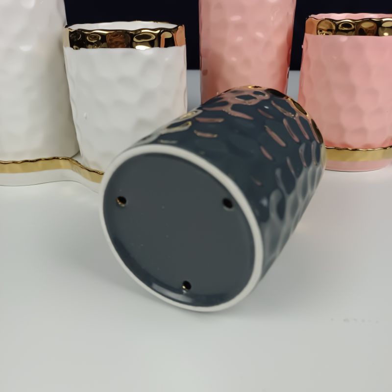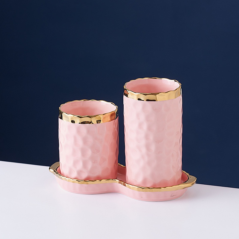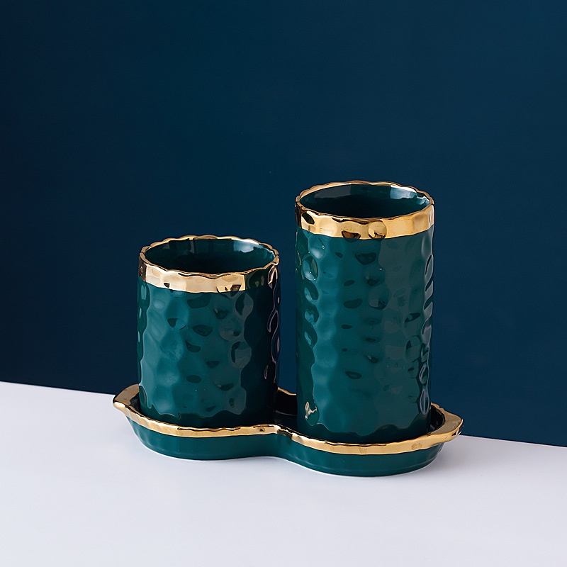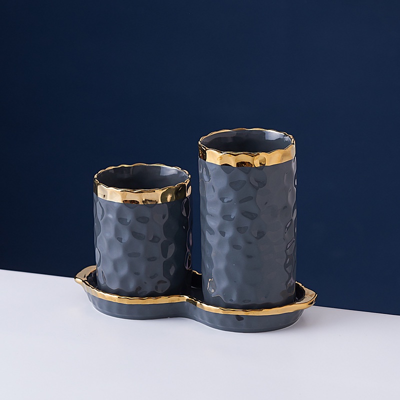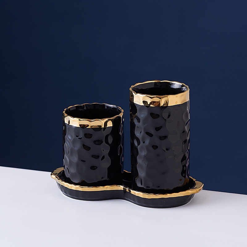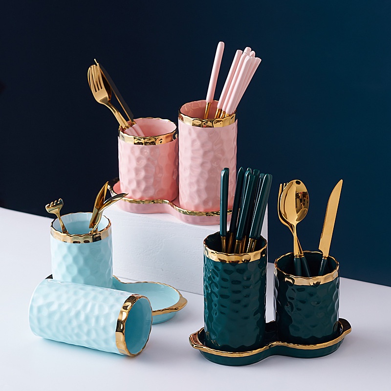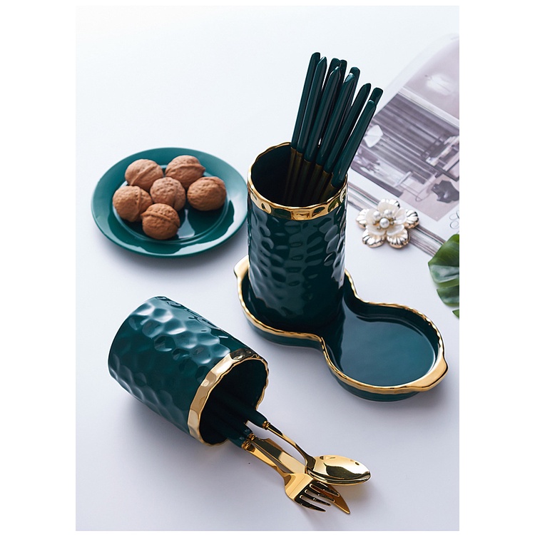 ASHOME Tempat Sendok Makan Keramik 2 Tabung List Gold Motif Totol Glossy / Spoon Storage Double Tube List Gold / Tempat Sendok Makan Keramik Mewah / Tempat Sendok Keramik Elegan / Tempat Sendok Keramik Aestetik