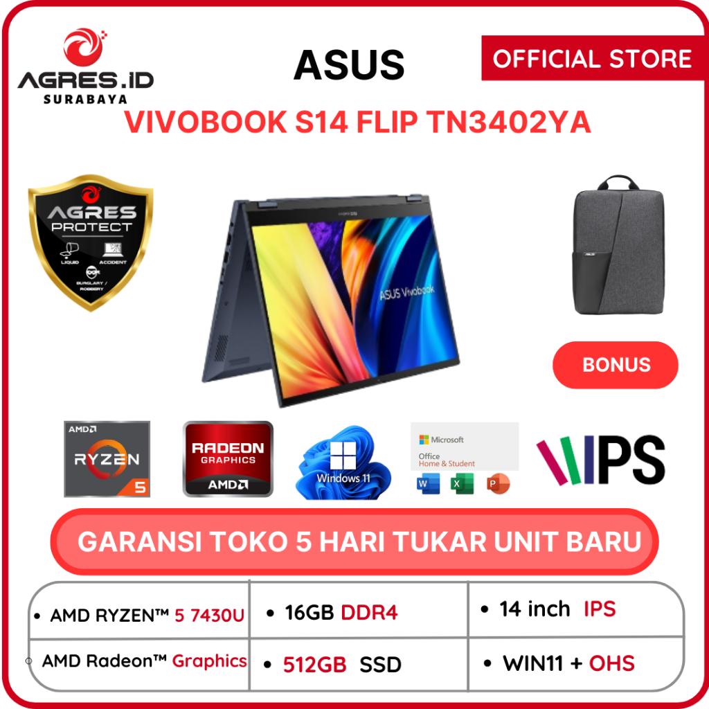 ASUS VIVOBOOK S14 FLIP TN3402YA Touch Ryzen 5 7430 16gb 512gb 14.0 wuxga vips 2in1 Windows 11+Office Resmi