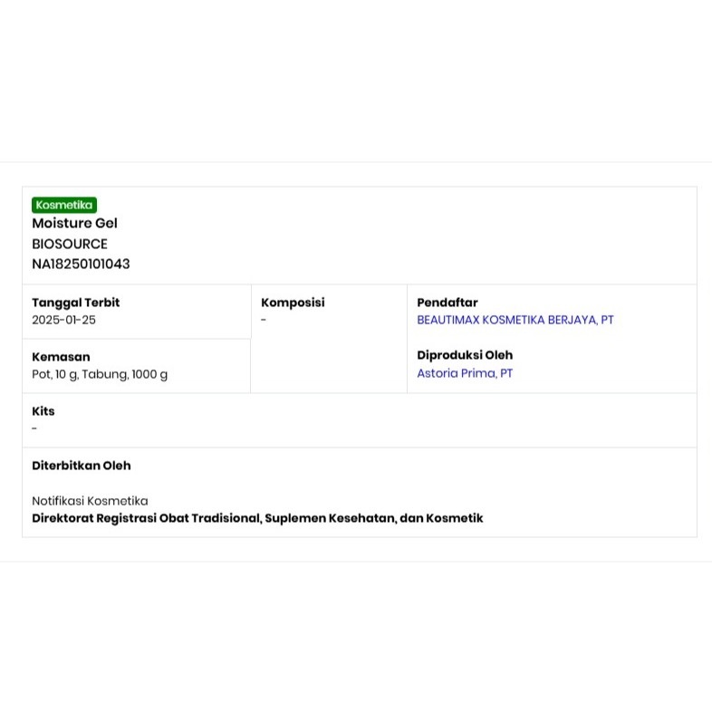 Biosource Moisture Gel 1KG | BPOM | Skincare