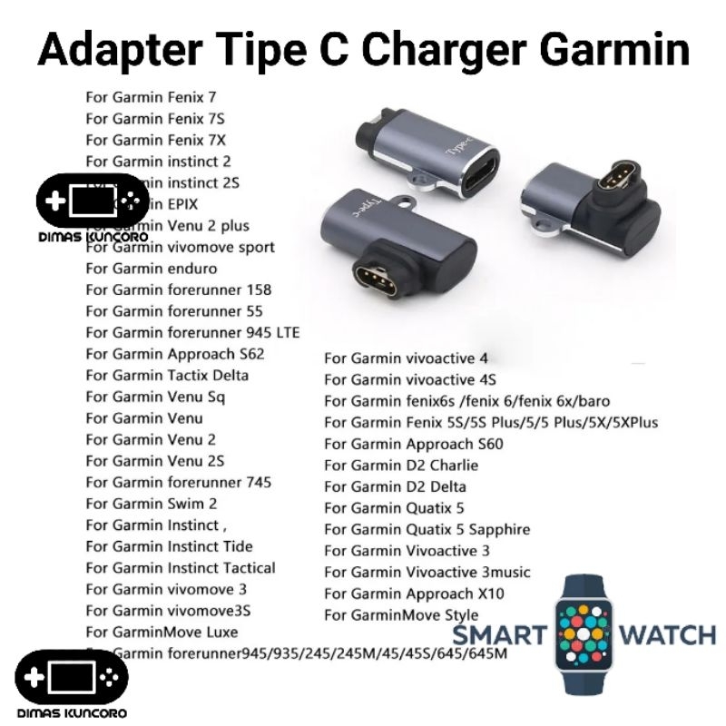 Adapter Tipe C Charger Garmin charging charger adaptor converter convertor charge tipe type c garmin venu 1 2 plus 2s 3 3s 4 41mm 45mm sq 1 2 music x1