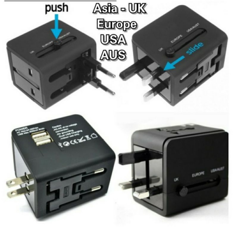 Adaptor Multi Negara USA EROPA ASIA AUSTRALIA AFRIKA & UMROH + 2 USB FREE POUCH Cantik