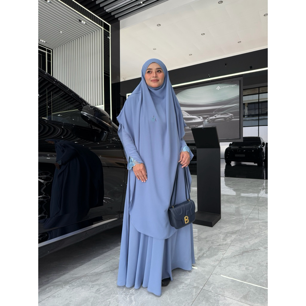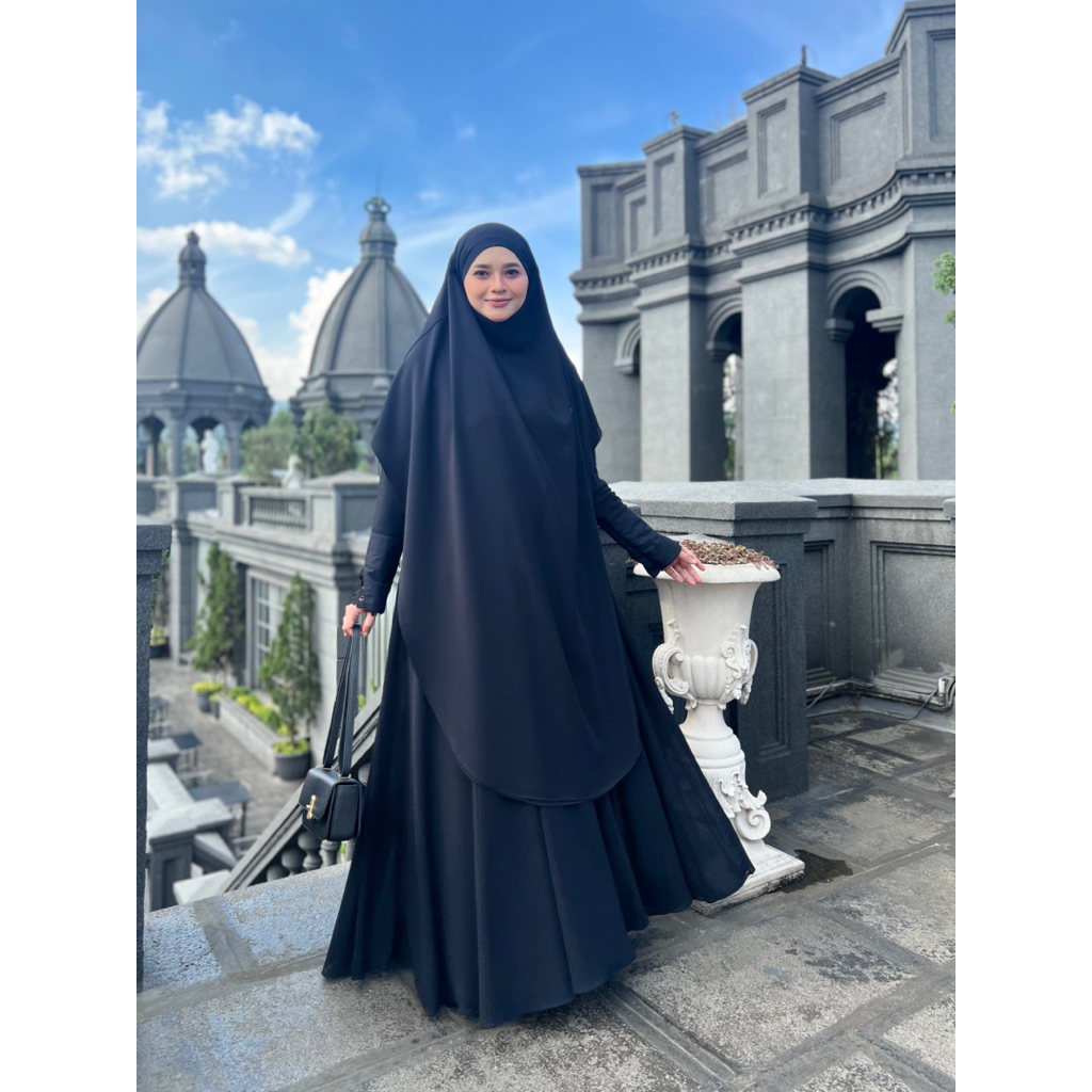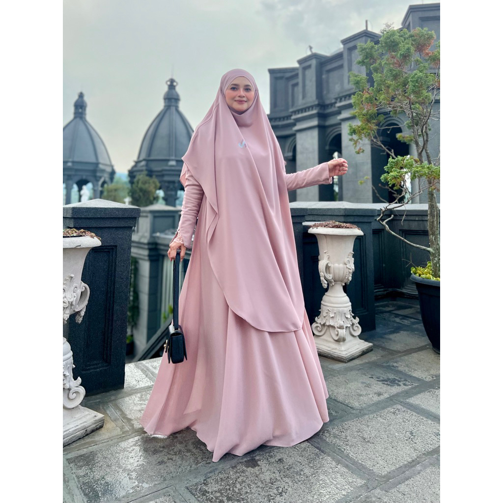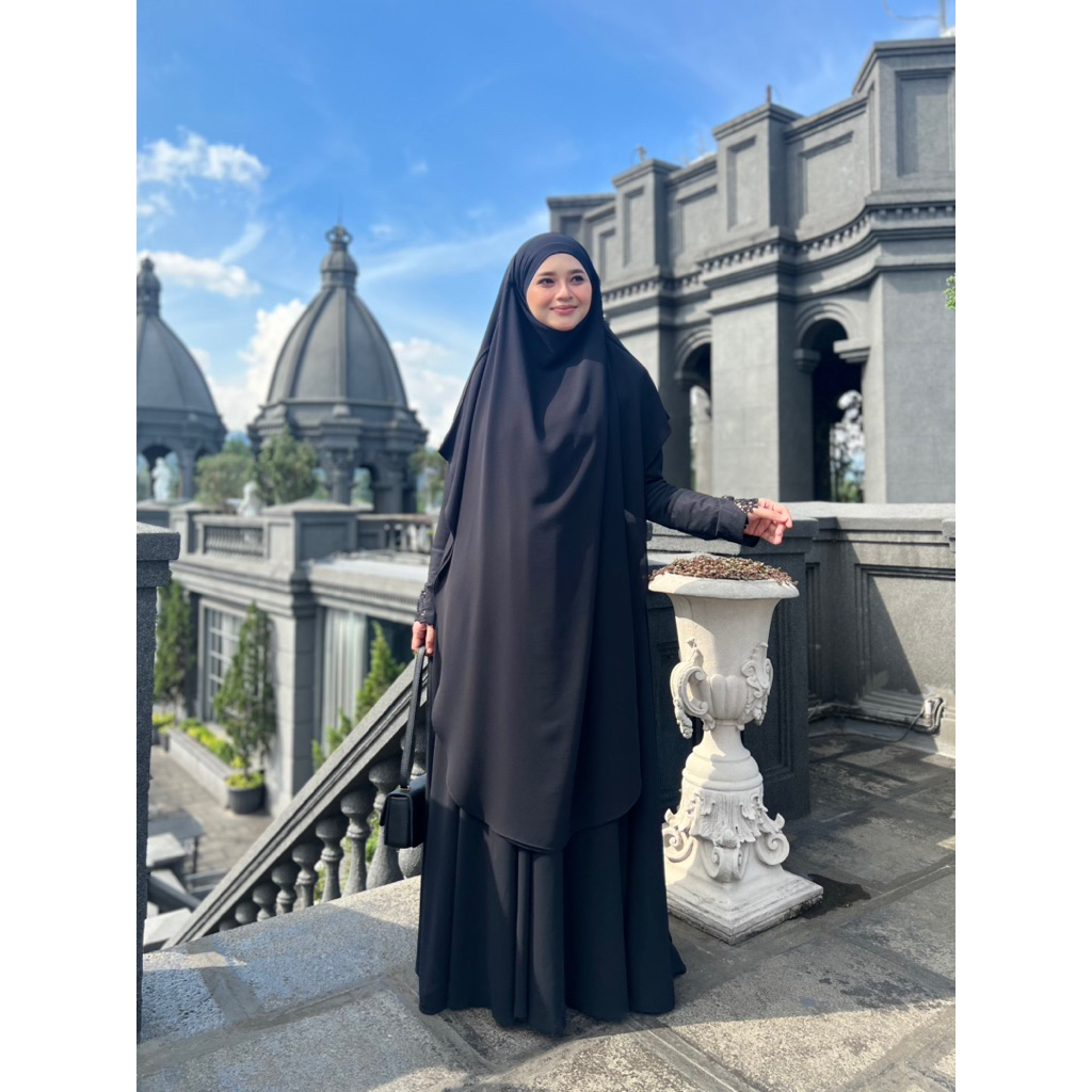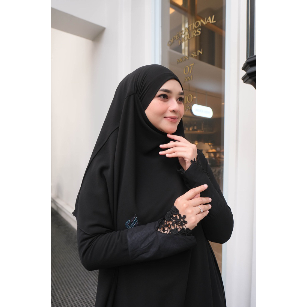 Adiva Set Gamis Dress Abaya Syari Lengan Brukat by Jesi Achmad Busana Muslimah untuk Umroh Haji Bahan Ceruty Mix Lengan Brukat