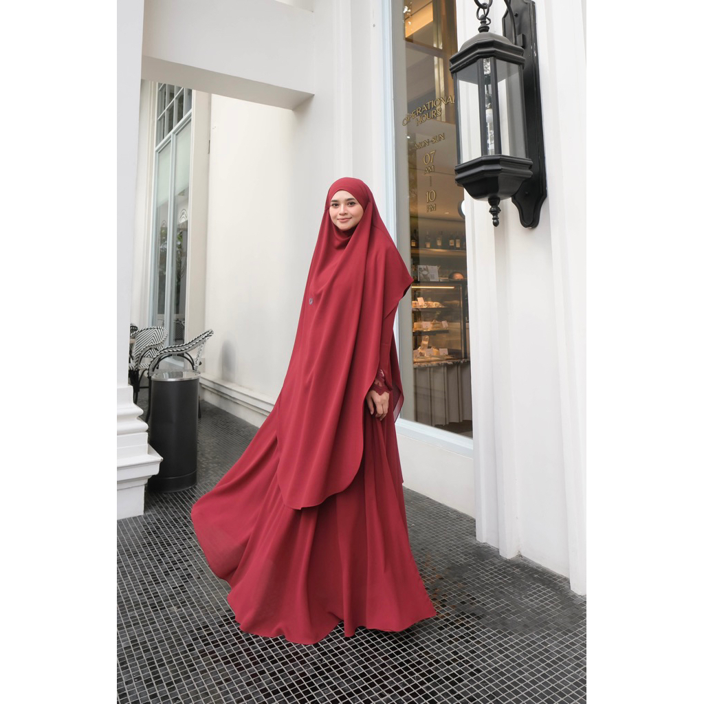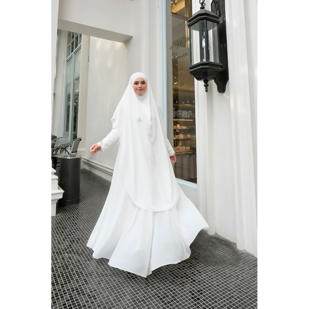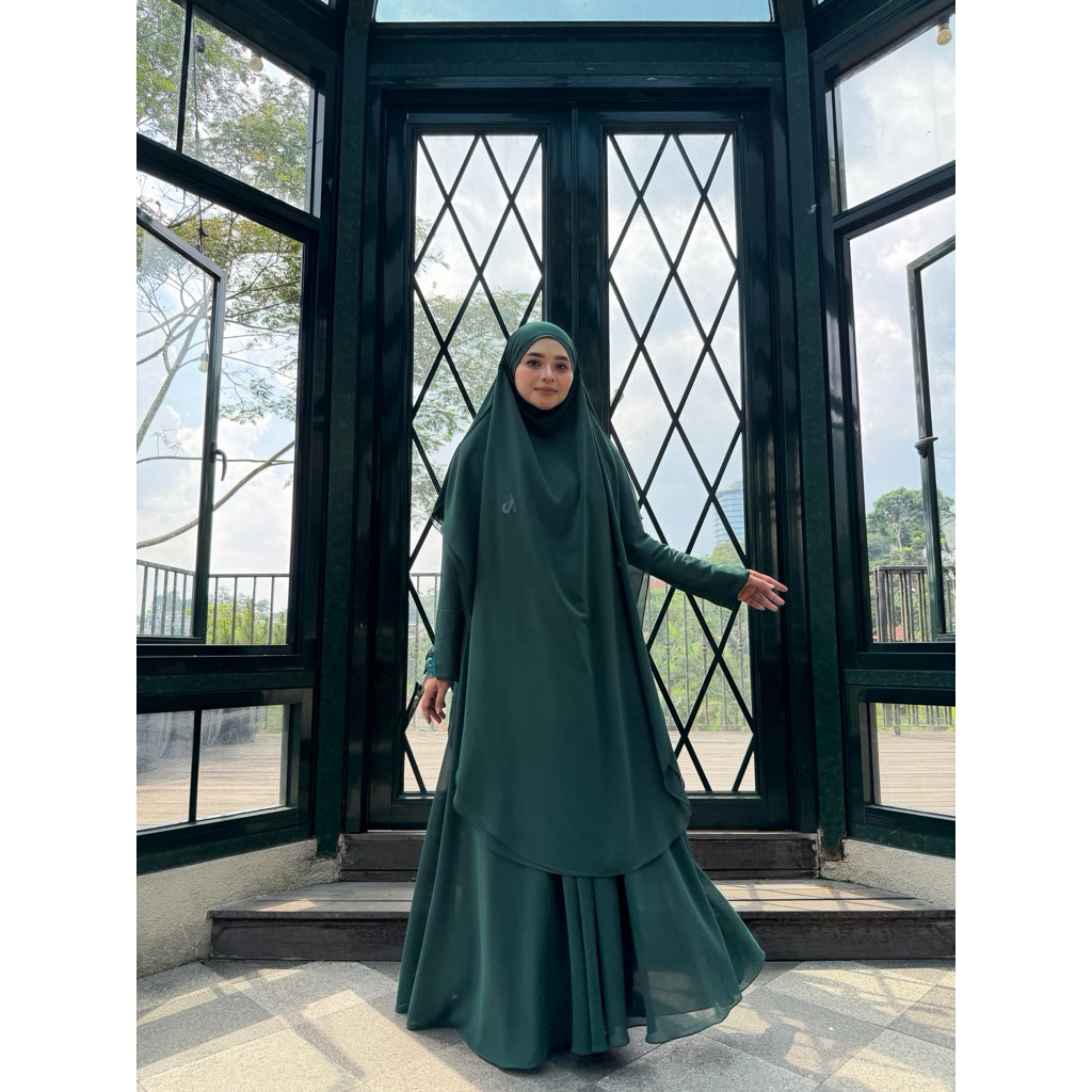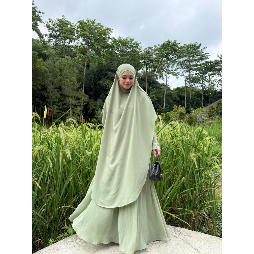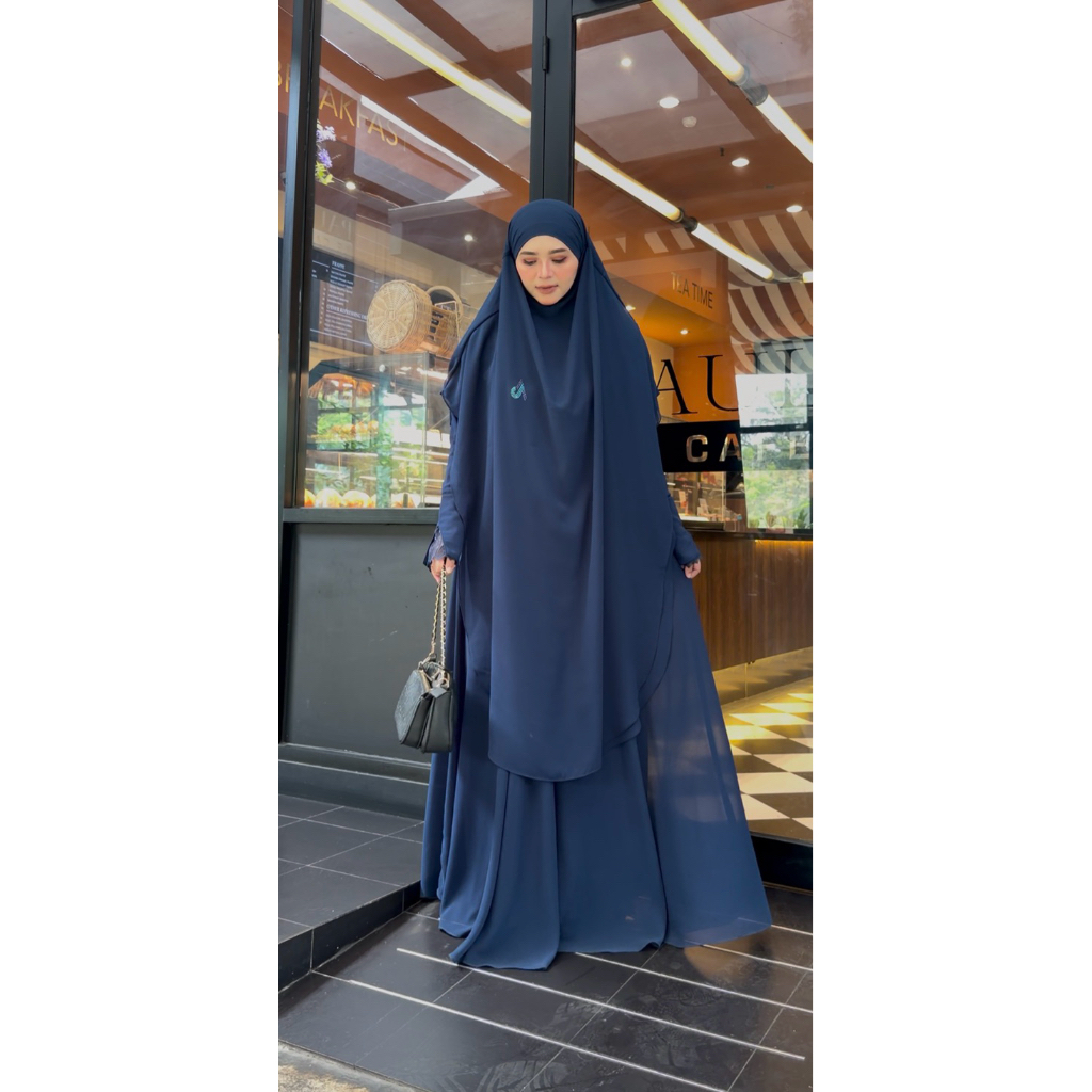 Adiva Set Gamis Dress Abaya Syari Lengan Brukat by Jesi Achmad Busana Muslimah untuk Umroh Haji Bahan Ceruty Mix Lengan Brukat