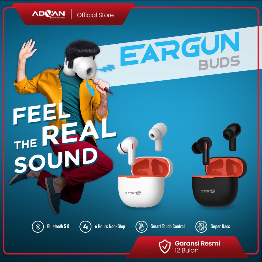 Advan StartGo Eargun - SUPREME BASS- In-Ear TWS Earphone Bluetooth Waterproof -TWS True Wireless Headset Murah Garansi Resmi
