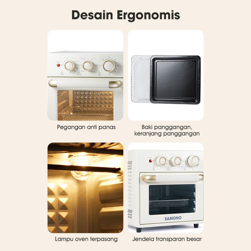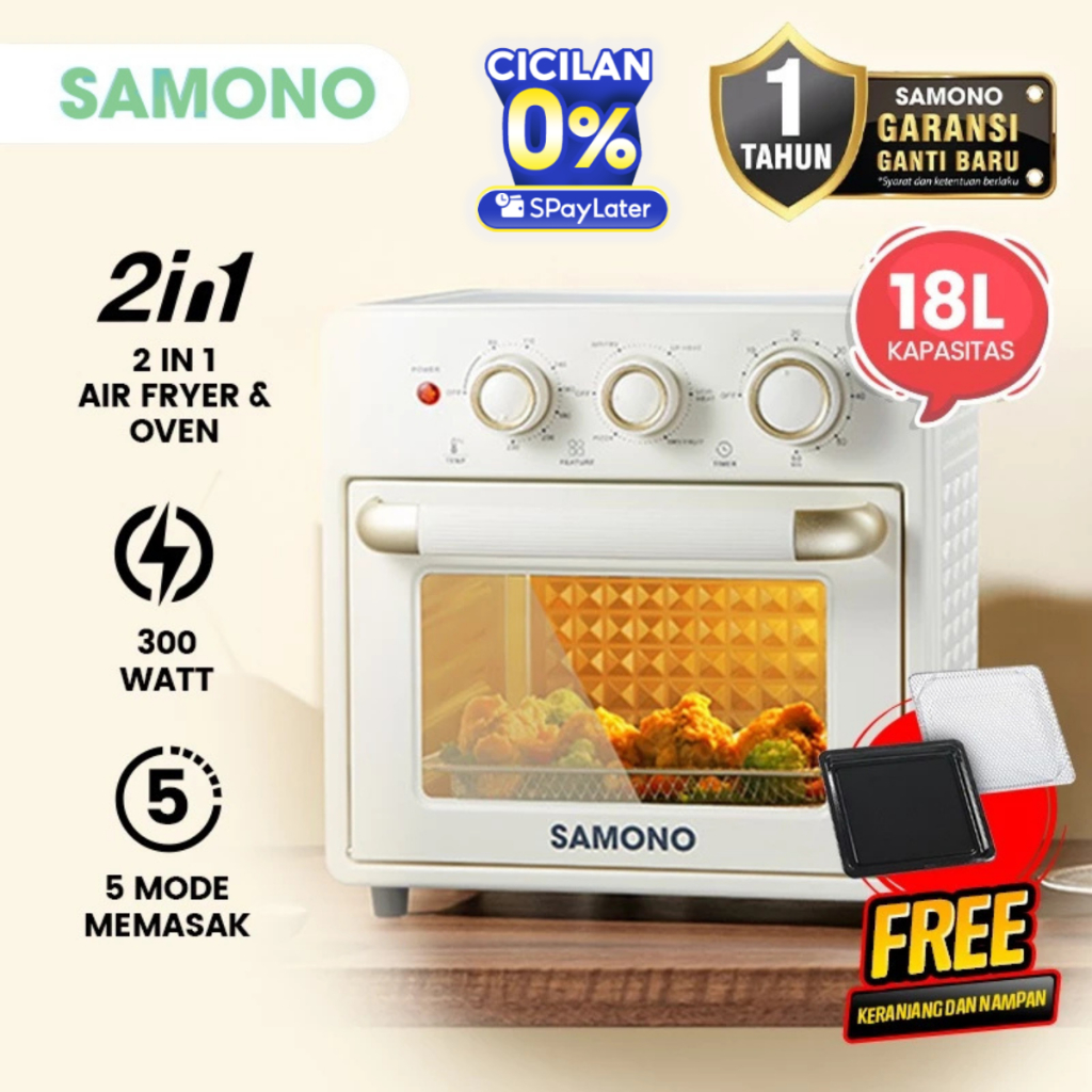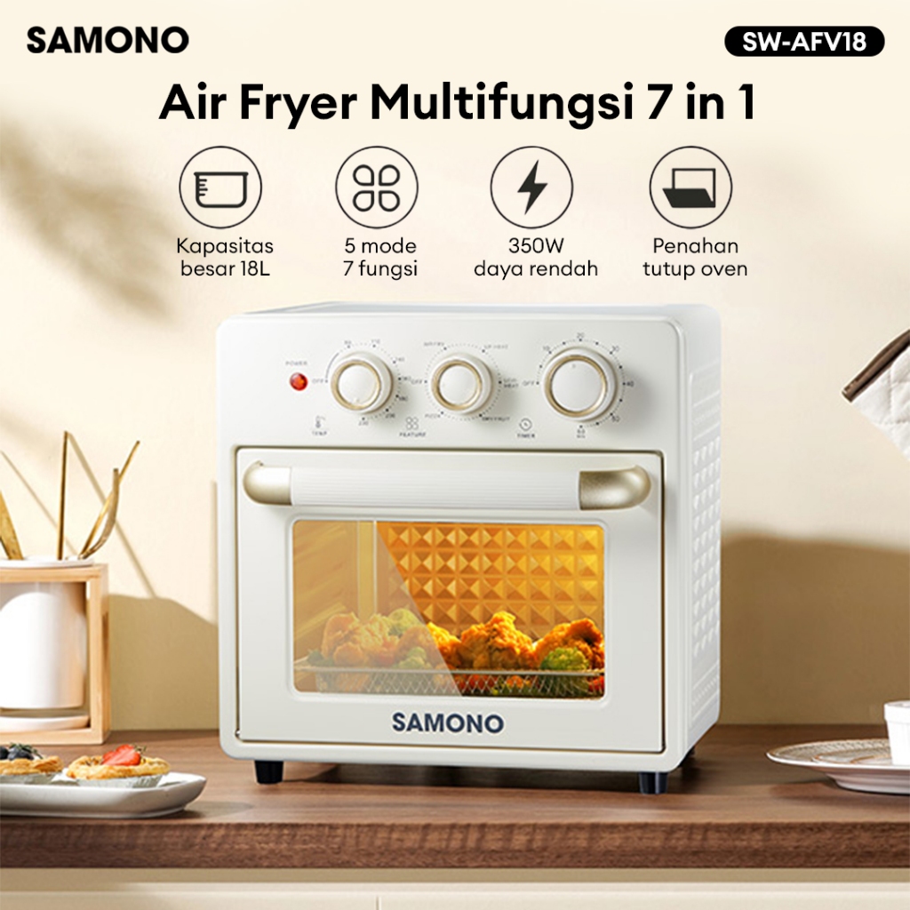 Air Fryer Oven SAMONO 18L Low Watt Oven Listrik 18 Liter Multifungsi Penggoreng Udara Tanpa Minyak Pemanggang Otomatis Serbaguna Kapasitas Besar Perlengkapan Dapur Estetik Murah Bergaransi Mesin Goreng Ayam Kentang Kue Tray Aksesoris Lengkap AFV18