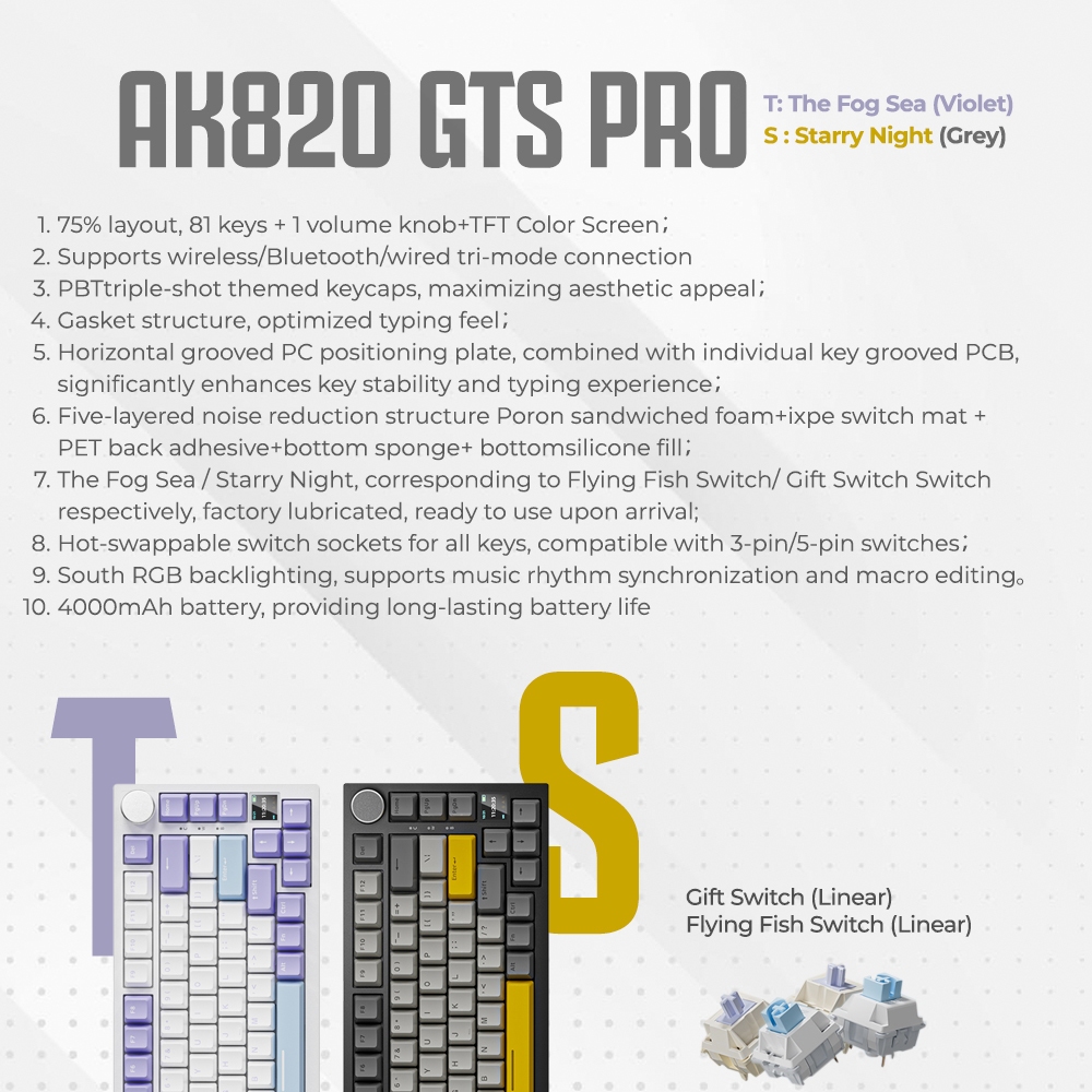 Ajazz AK820 GTS PRO 75% Keyboard Gaming Mechanical Wireless 3-Mode RGB Hotswappable 5 pin Gasket Mount with TFT LED