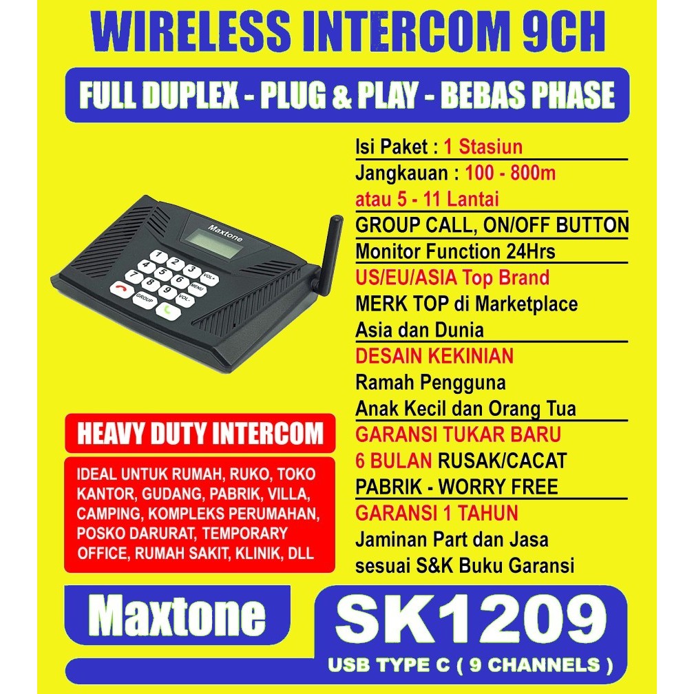 Alat Panggil Bicara Intercom wireless interkom 2 arah bicara tanpa kabel Tanpa Pencet Pencet Tombol Auto Talk Full duplex wireless intercom 2 way MAXTONE SK1209 - Paket 1 Unit