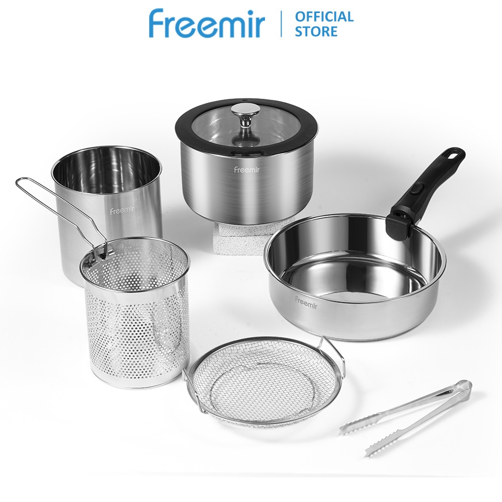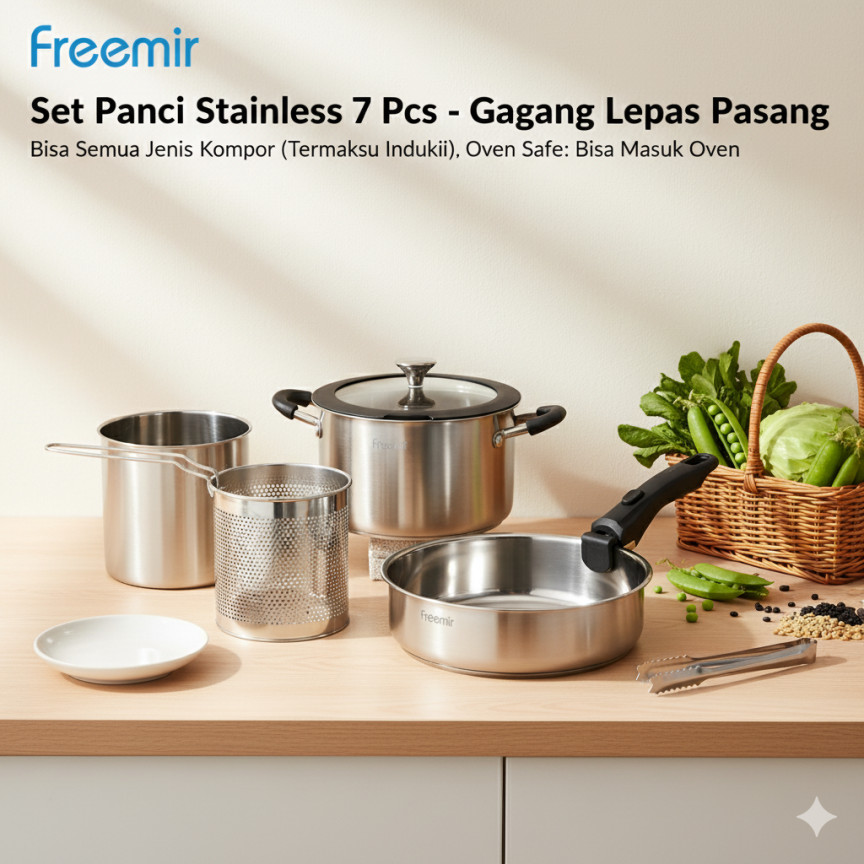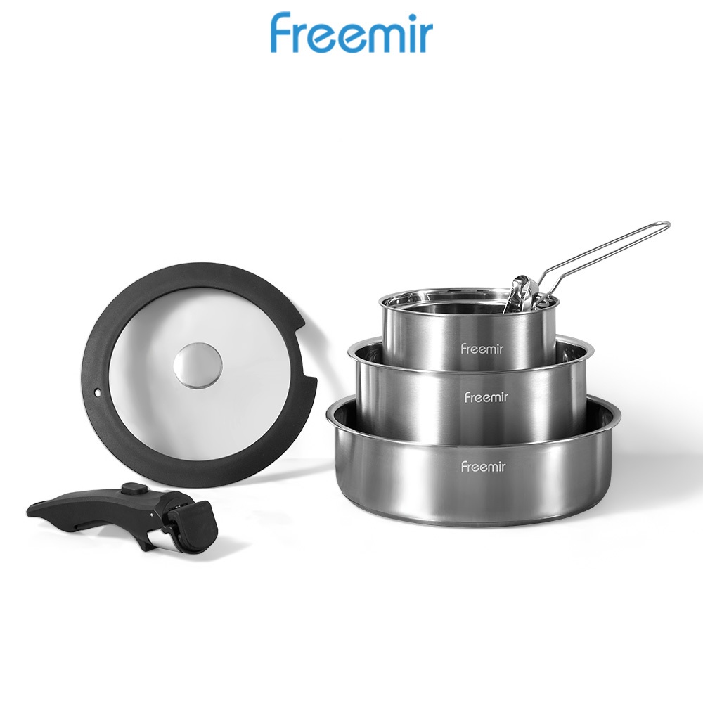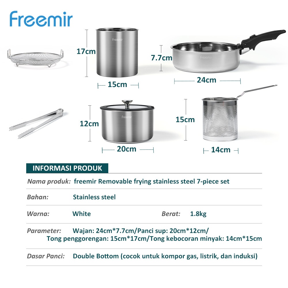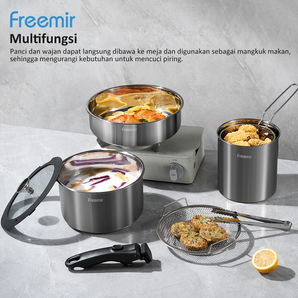 freemir Set Alat Masak Stainless Steel 7 Pcs Panci Penggorengan Gagang Lepas Pasang / Detachable Handle Cookware Set Hemat Ruang Oven Safe