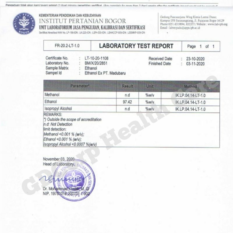 Alkohol Food Grade 70% & 96% Citomed Health Care Original Izin Kemenkes RI, certificate IPB
